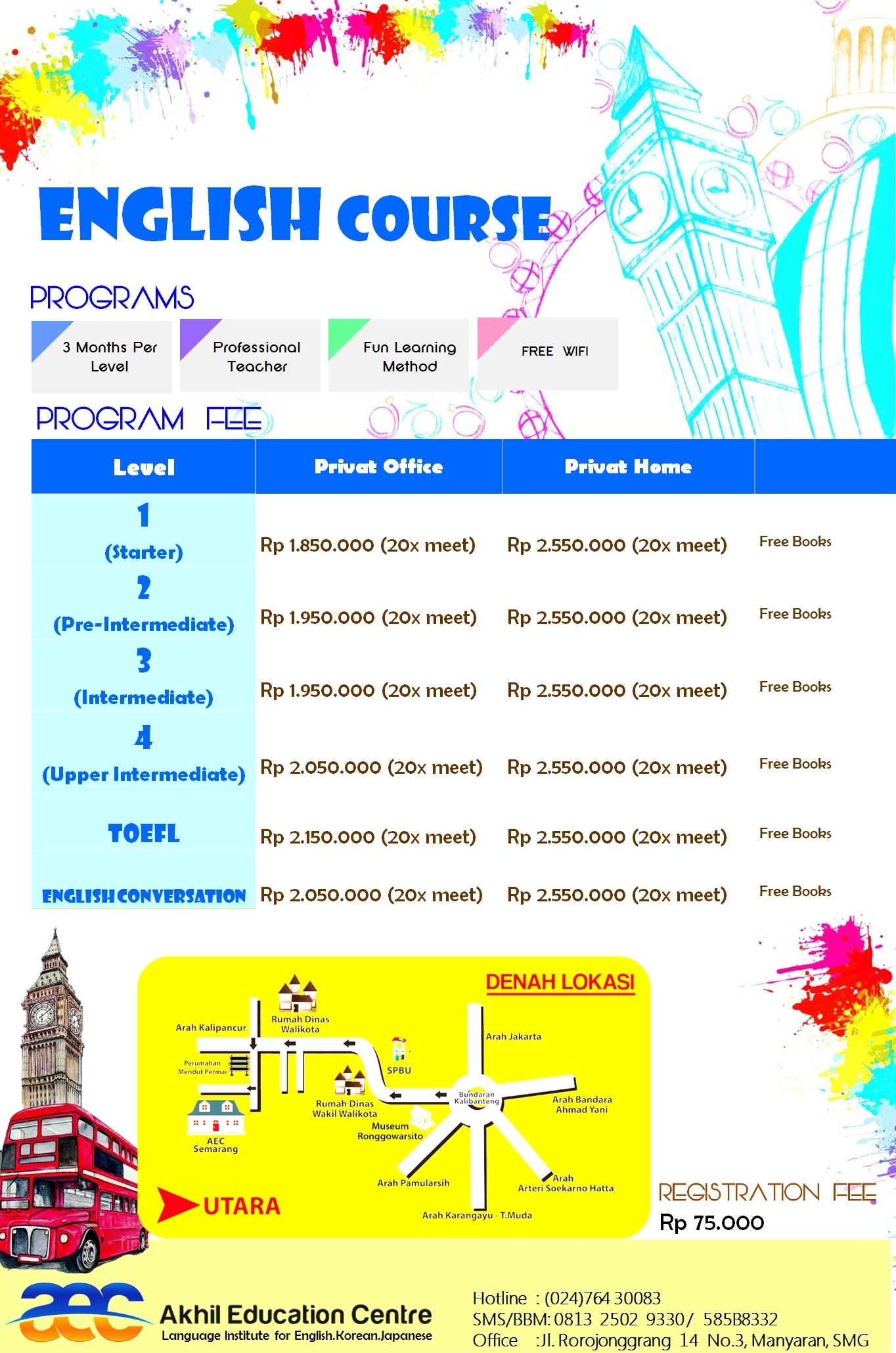 Apabila Anda ingin memperdalam kemampuan berbahasa Inggris atau mengikuti ujian level bahasa Inggris, silakan belajar dna bergabung di kelas kursus Bahasa Inggris Umum di AEC Semarang.