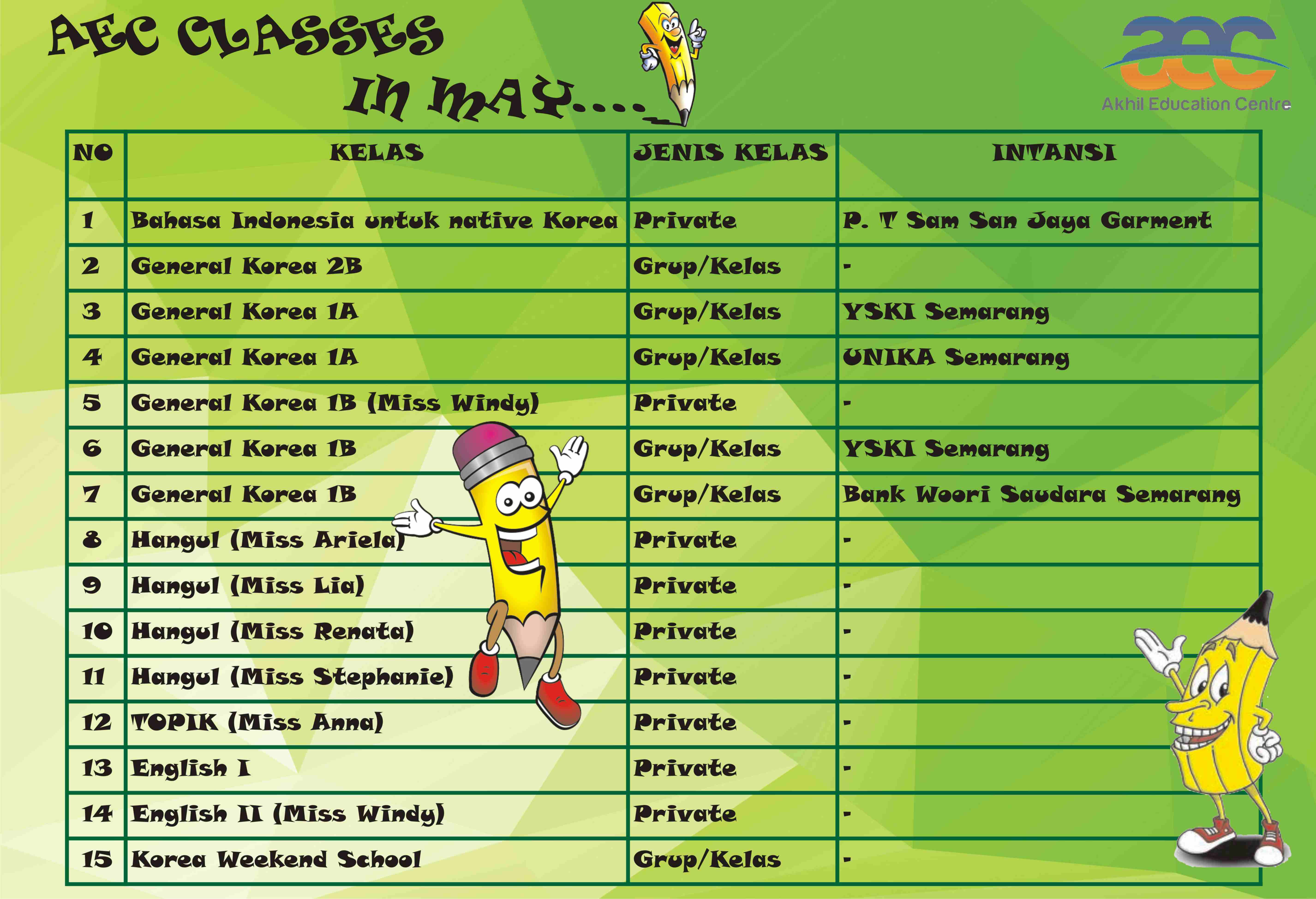 Kelas-kelas di AEC Semarang pada bulan Mei iniย terdiri atas kelas Bahasa Korea dan kelas Bahasa Inggris. Kelas Bahasa Korea meliputi kelas Hangul, kelas General Korea baik 1A, 1B, maupun 2B serta kelas TOPIK sedangkan kelas Bahasa Inggrisnya yaitu kelas General Pre-Intermediate.