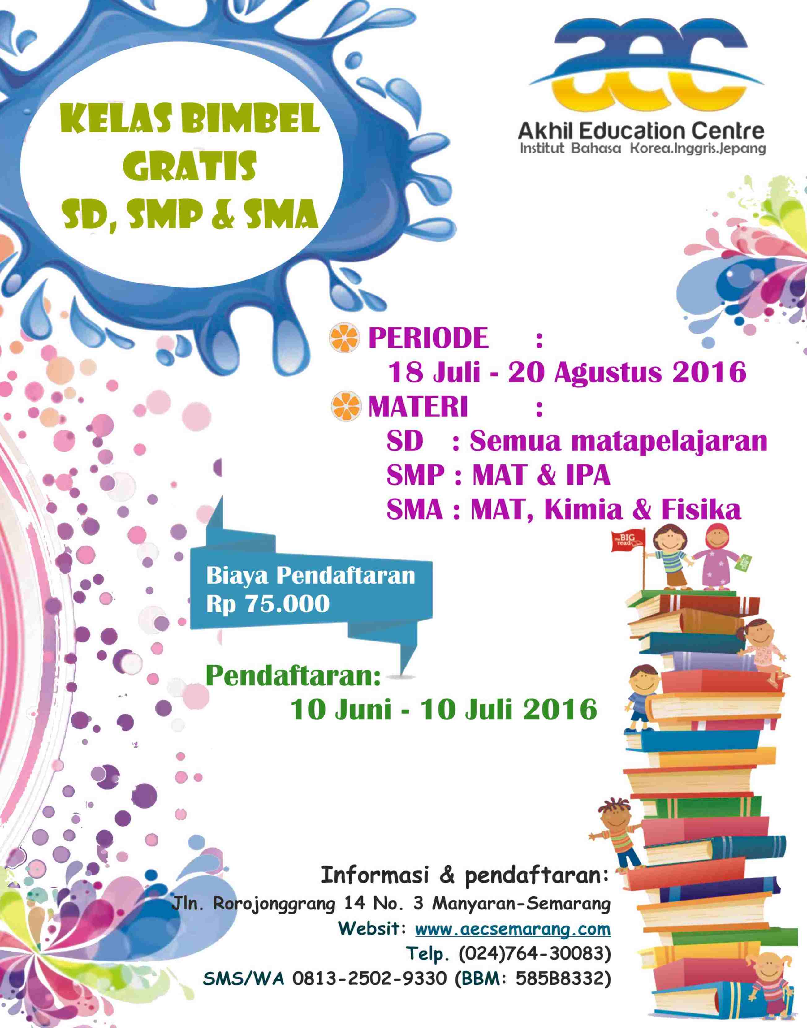 Menyambut tahun ajaran baru yang tinggal sebentar lagi Akhil Education Centre (AEC) Semarang membuka kelas Bimbingan Belajar GRATIS bagi siswa SD, SMP, hingga SMA. Kelas Bimbel GRATIS ini untuk periode 18 Juli – 20 Agustus 2016. Materi bimbingan belajar yang akan diberikan bagi siswa SD meliputi semua matapelajaran, siswa SMP meliputi matematika dan IPA sedangkan siswa SMA akan belajar matematika, fisika, dan kimia.