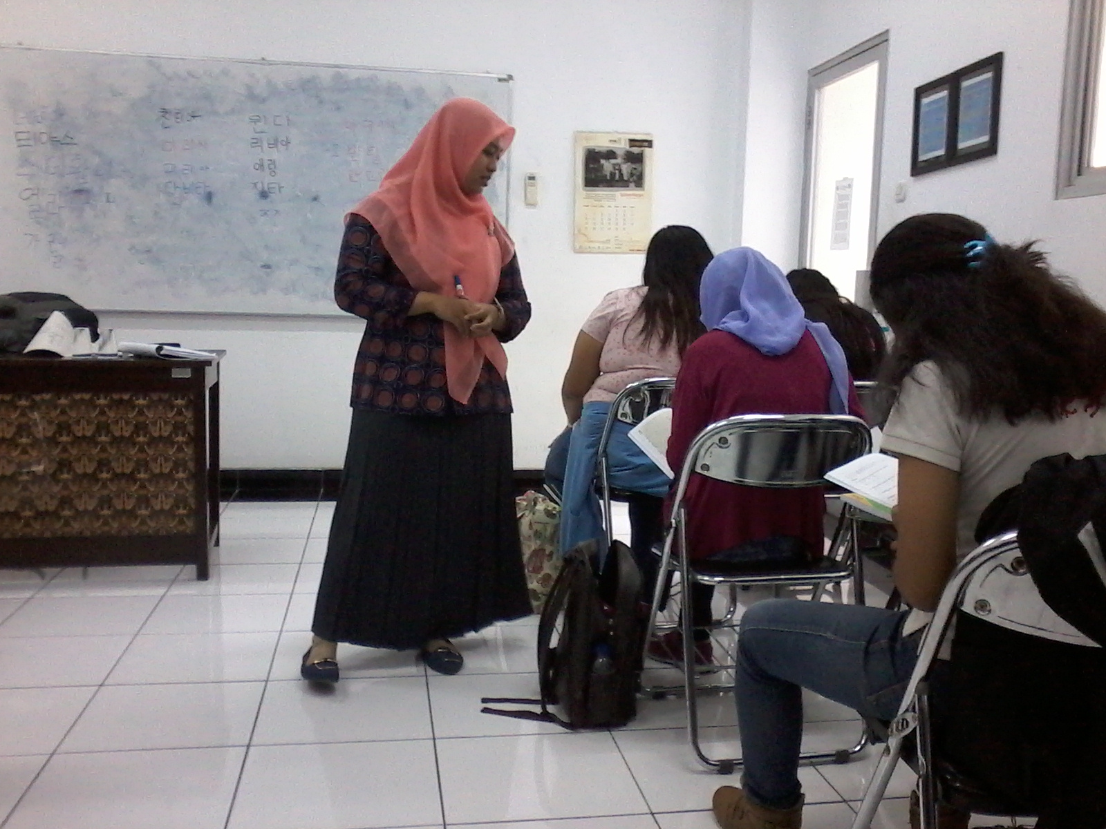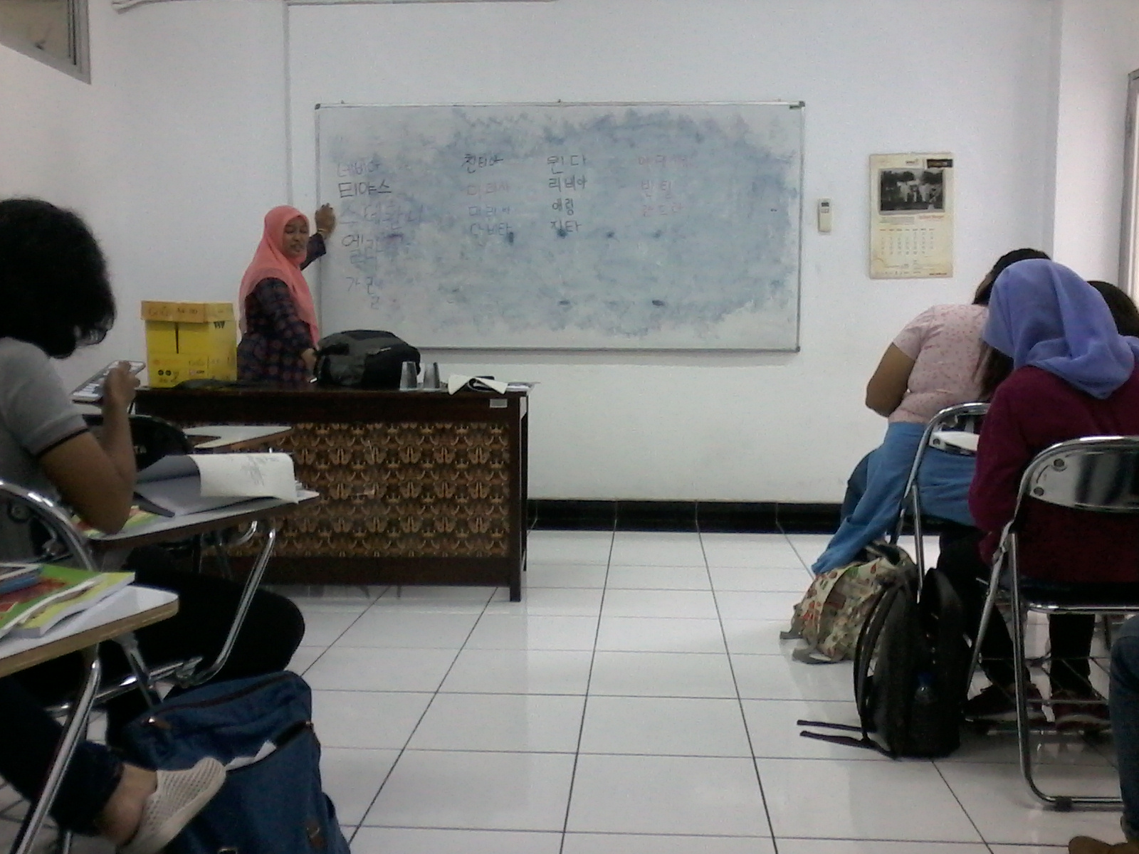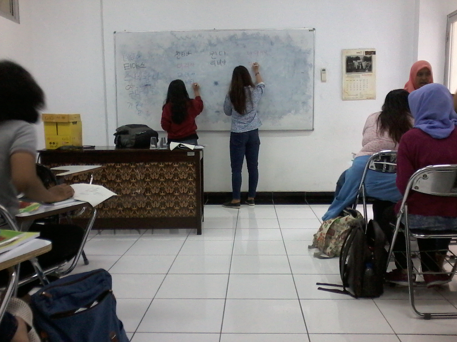 Kelas Bahasa Korea ini diampu oleh Ssaem Ilif. Kelas perdana siang hari tersebut diisi Ssaem Ilif dengan mengenalkan huruf Bahasa Korea atau yang lebih di kenal dengan huruf Hangul. Mahasiswa diajarkan menuliskan nama masing-masing dalam huruf Hangul. Kelas Bahasa Korea ini diadakan setiap hari Rabu dan Jumat pukul 11.00 hingga 12.00 dan akan berlangsung hingga perkuliahan semester ganjil ini berakhir yaitu pada awal bulan Desember 2016. Semoga kerjasama antara Akhil Education Centre Semarang dengan Universitas Katolik Soegijapranata terus terjalin.