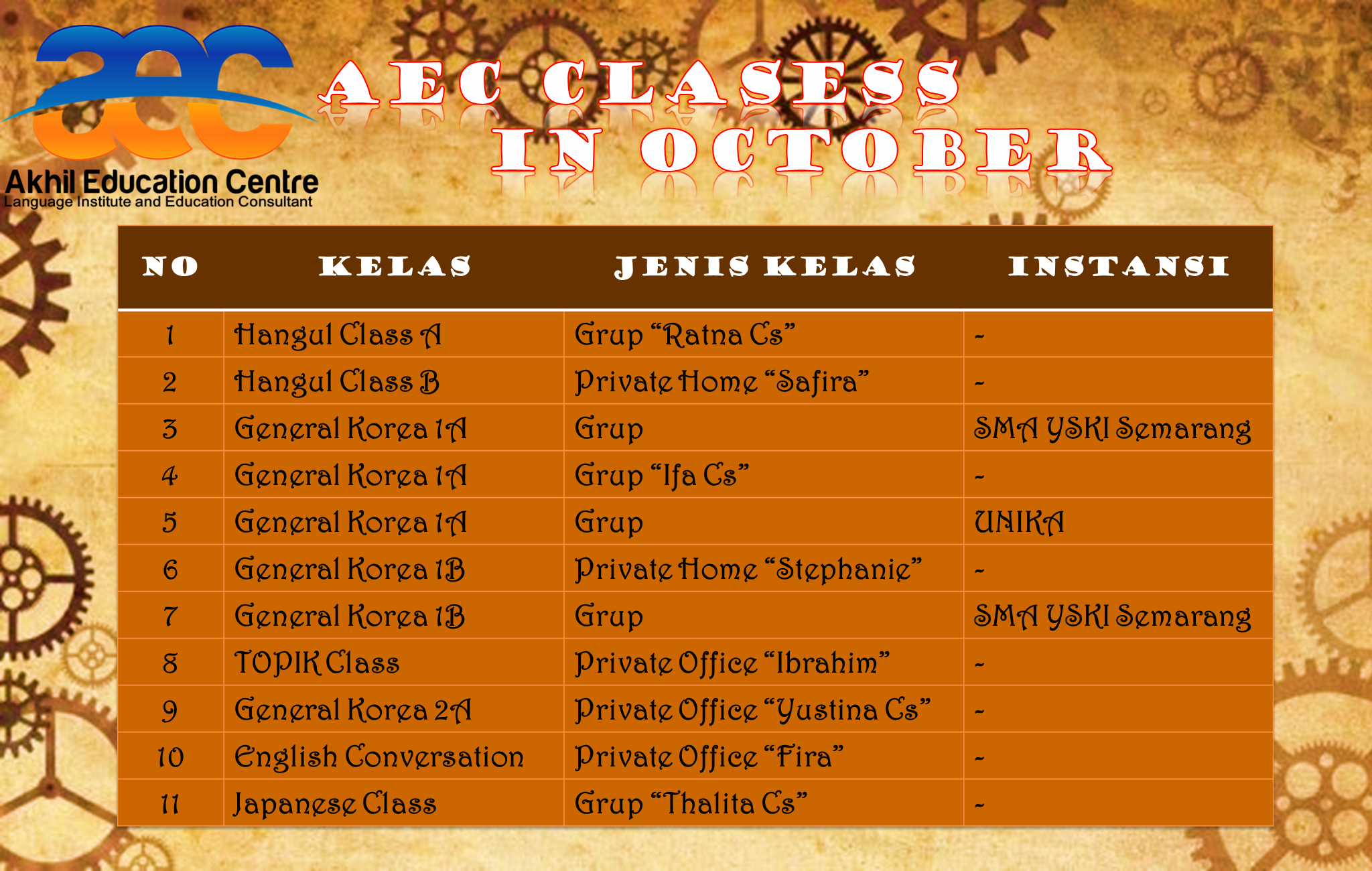 Bulan Oktober 2016 ini, Akhil Education Centre (AEC) Semarang memiliki 11 kelas bahasa. Kelas tersebut meliputi kelas Korean Course, Japanes Course, dan English Course. Kelas Korean Course terdiri atas Hangul Class, General Korea Level 1A, General Korea 1B dan General Korea Level 2A. Kelas Korean Course ini diampu oleh Anna Ssaem, Nissa Ssaem, dan Uyun Ssaem. Kelas Japanes Course diampu oleh Sense Nabila. Kelas English Course diampu oleh Miss Nina.