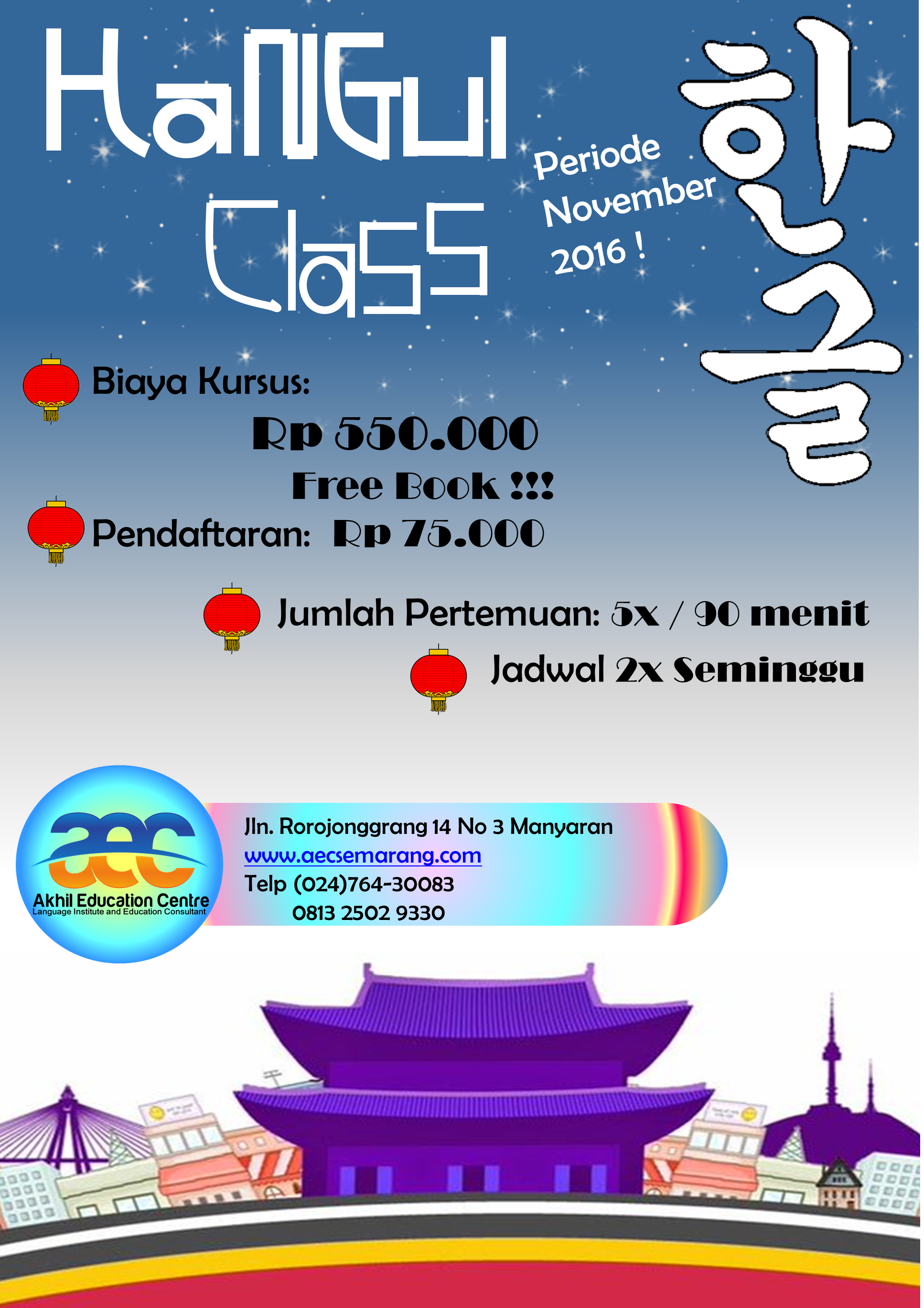 Akhil Education Centre [AEC] Semarang, Minggu kemarin membawa SMA Negeri 4 Magelang, bertolak ke Negara Korea Selatan atau yang lebih di kenal dengan negara K-POP ini. Kunjungan ke Korea ini merupakan bentuk kerjasama antara AEC Semarang dengan SMA Negeri 4 Magelang dalam program Korea Edutrip Batch II. Program Korea Edutrip Batch II ini berlangsung selama satu pekan yaitu dari tanggal 7 – 13 November 2016.