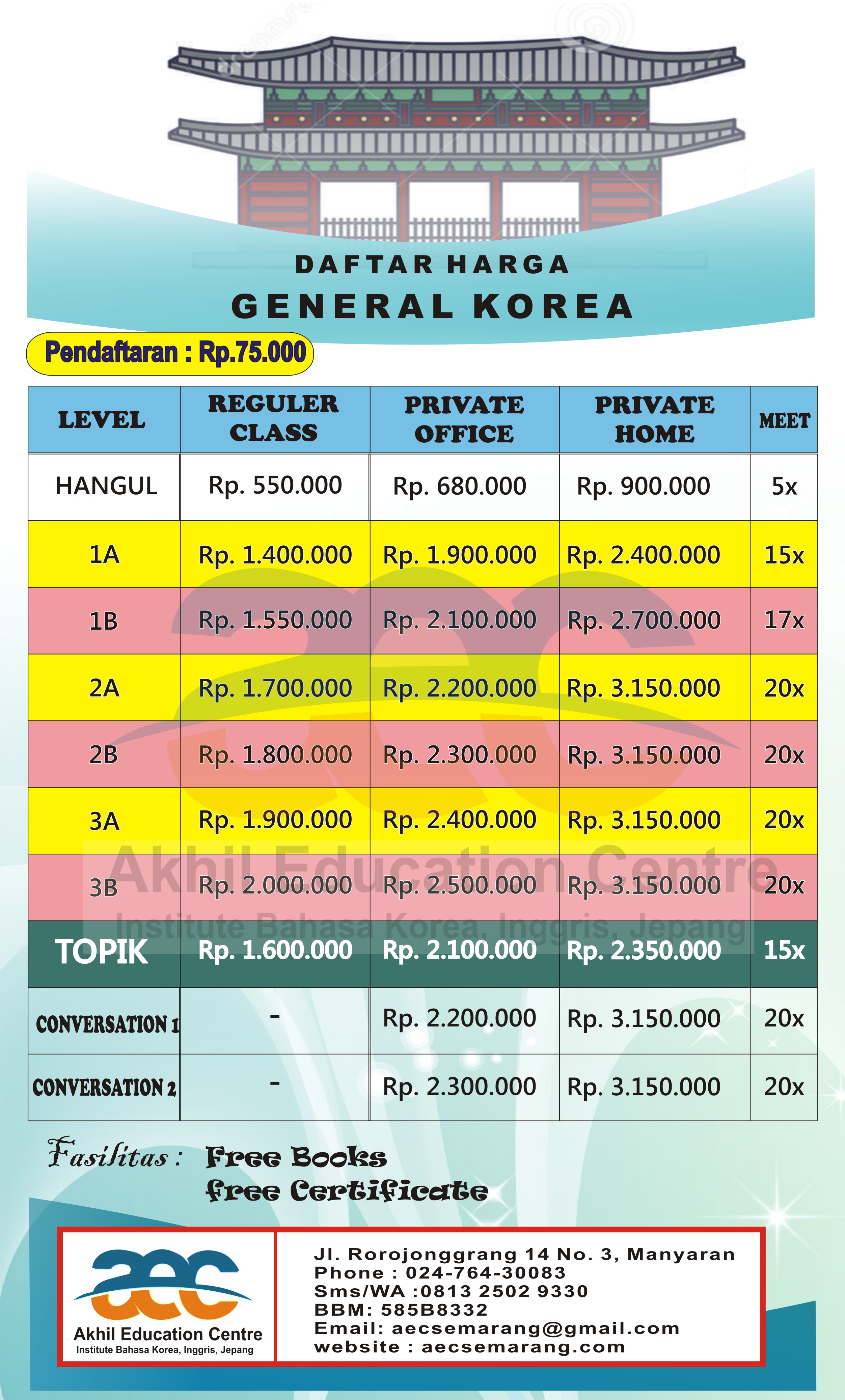 Tahun 2016 telah usai saatnya menyongsong tahun 2017 dengan semangat yang baru tentunya ya. Akhil Education Centre (AEC) Semarang tahun 2017 memberikan program-program kursus Bahasa Korea terbaru bagi kalian semua. Kalian yang hendak belajar Bahasa Korea tak perlu khawatir lagi sekarang. Banyak pilihan programnya lho. Pengajar Bahasa Korea kami, juga bisa di datangkan ke langsung ke rumah ya guys. Jadi, bagi kalian yang sangat ingin belajar Bahasa Korea namun sibuk sehingga tidak bisa langsug datang ke AEC, tenang saja pengajar bisa datang ke tempat kalian. Tunggu apa lagi, ayo segera merapat ke AEC Semarang dan saatnya belajar BAHASA KOREA !!!!!