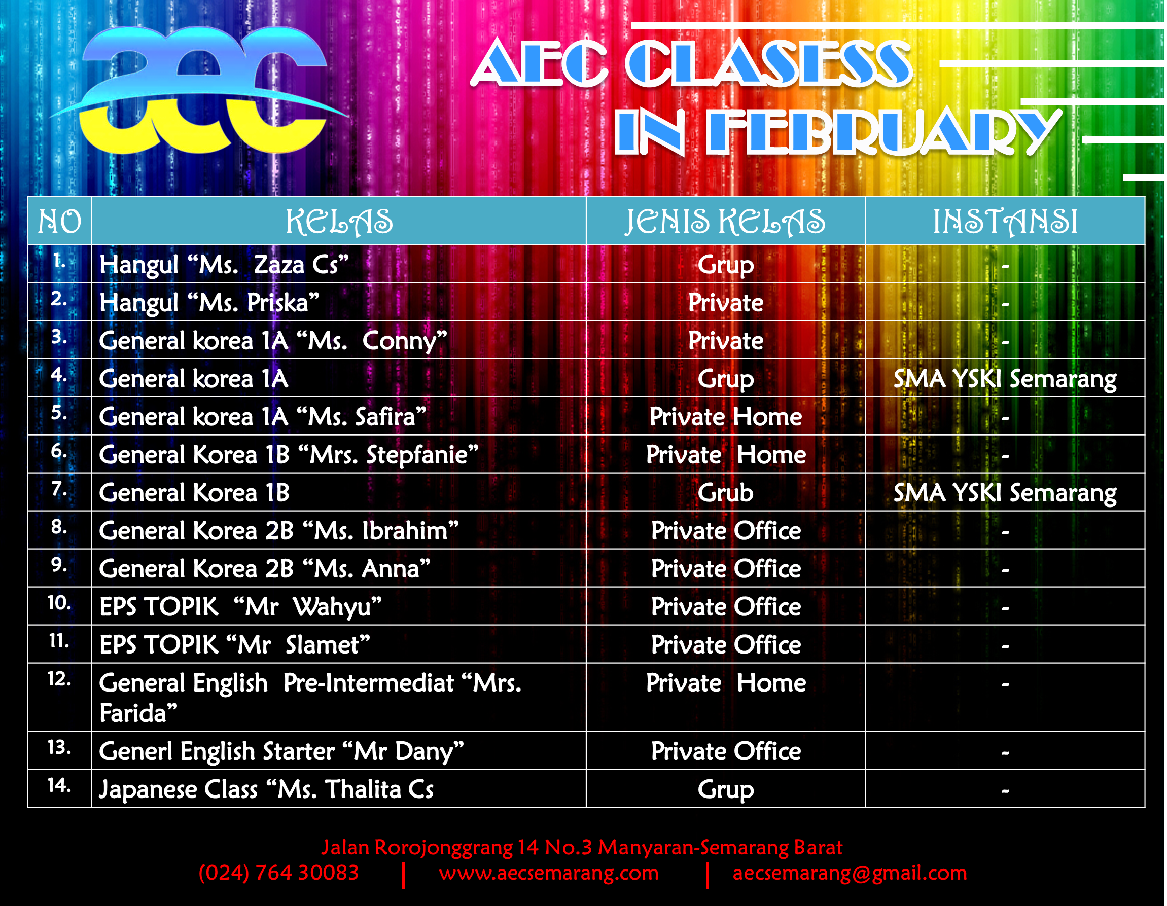 Kelas Bahasa Korea AEC bulan ini meliputi Hangul Class, General Korea 1A, General Korea 1B, General Korea 2B, dan EPS TOPIK. Kelas Bahasa Inggris AEC bulan ini meliputi General English Pre-Intermediate dan General English Starter. Kelas Bahasa Jepang meliputi Shokyu B. Kelas-kelas tersebut baik kelas yang privat home, private office, kelompok, maupun yang diinstansi.