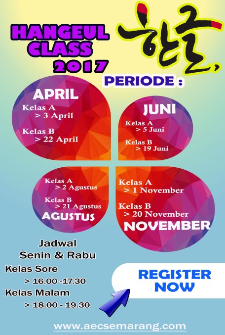 Bagi yang belum sempat bergabung di kelas hangeul periode April 2017 tak usah sedih ya, karena masih ada periode Juni, periode Agustus dan periode November. Buruan mendaftar dari sekarang biar tidak ketinggalan lagi.