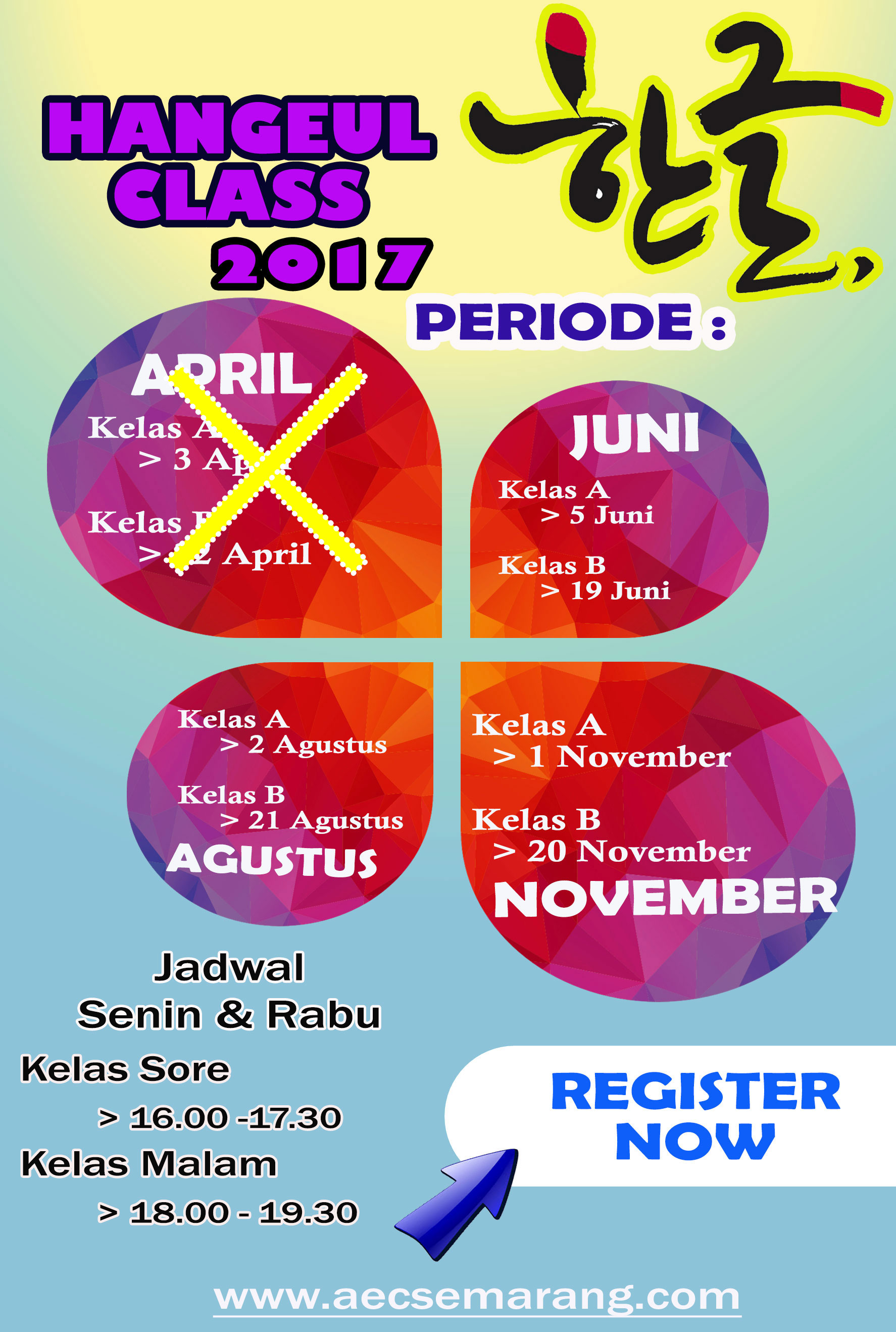 Kelas Bahasa Korea AEC di Periode Juni ini terbatas ya. Hanya ada 2 sesi yaitu: