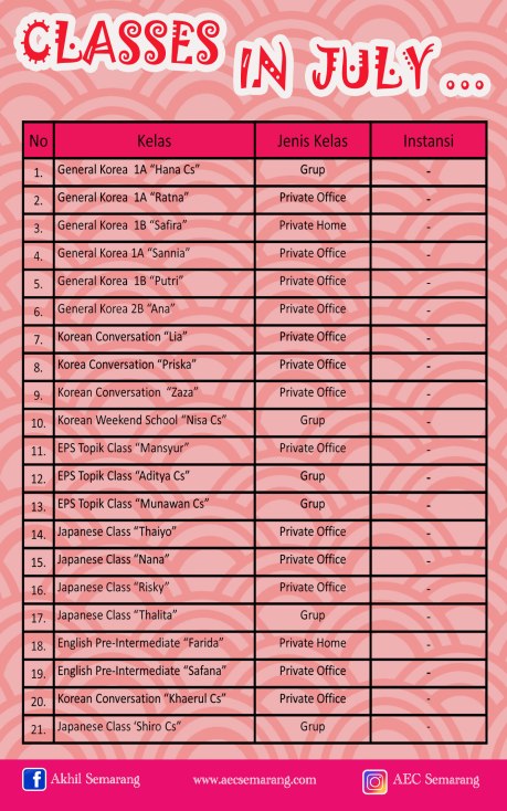 Bulan ini Akhil Education Centre (AEC) mempunyai beberapa tipe kelas guys. Ada kelas Bahasa Korea, Bahasa Jepang dan Bahasa Inggris. Kelas-kelas bahasa yang dimiliki AEC bulan ini terbagi menjadi beberapa level ya. Kelasnya siapa saja dan level apa saja. Yuh simak pada poster di bawah.