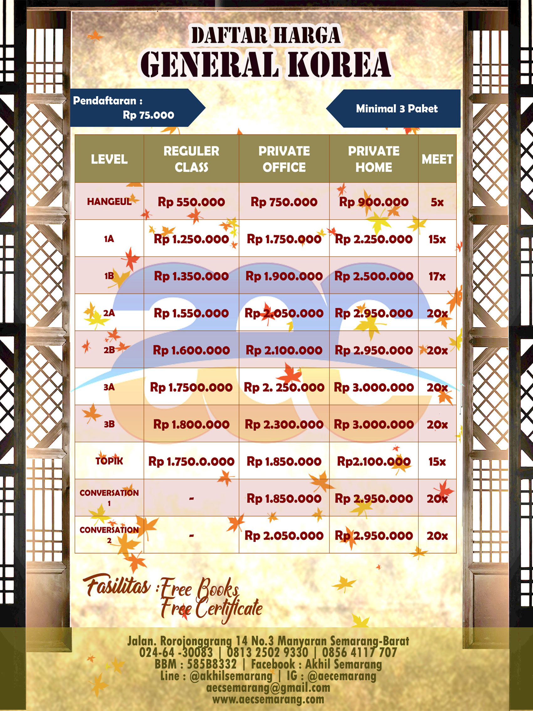 Simak biaya kursus Bahasa Korea kami pada poster di bawah ini ya…
