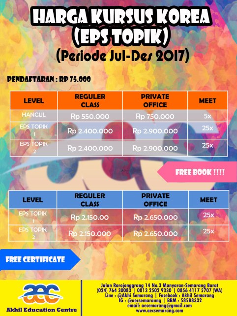 Akhil Education Centre (AEC) Semarang masih membuka kelas EPS TOPIK. Ada kelas pagi, siang, sore bahkan malam. Bagi yang ingin belajar Bahasa Korea untuk mempersiapkan ujian EPS TOPIK mendatang yuk ke AEC saja.