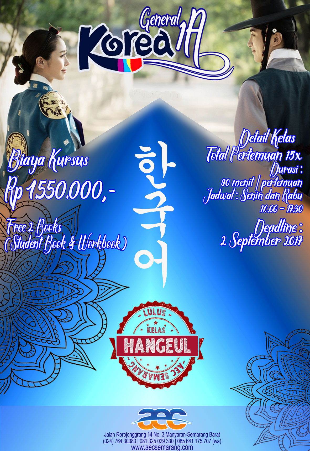 Jika membicarakan mengenai Bahsa Korea di Semarang pastinya sudah tidak asing lagi dengan Akhil Education Centre (AEC) Semarang. Pencinta Korea atau yang mempelajari Bahasa Korea pasti sudah sering mendengarnya.
