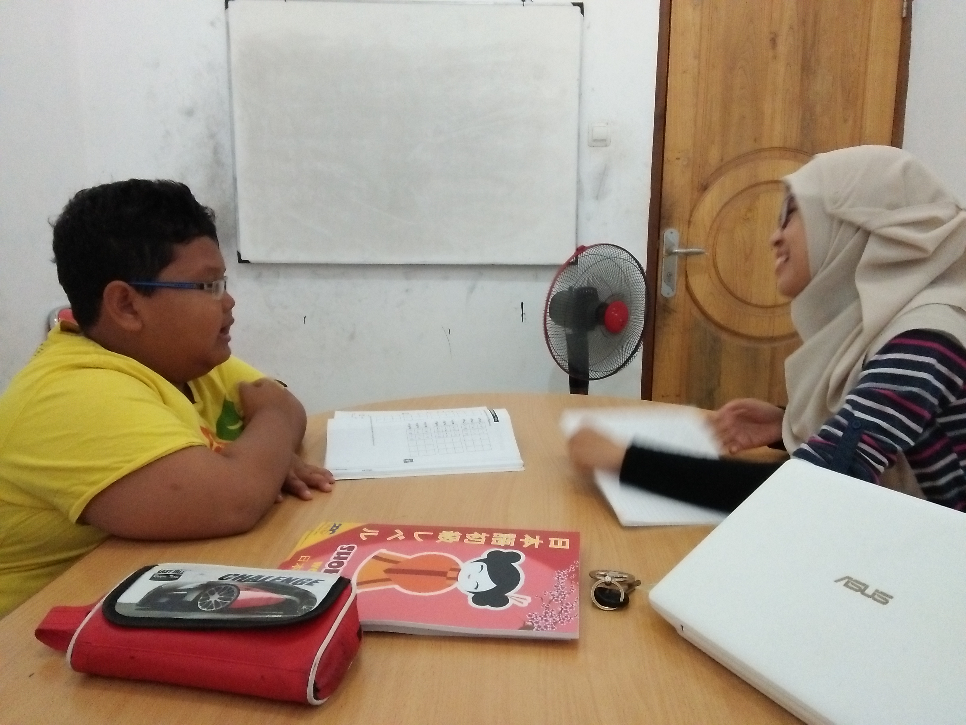 Saat ini Taiyo-san sudah naik level di kelas Shokyu B. Wah cepat sekali ya. Taiyo-san memang mengambil kelas private office dengan pemadatan jadwal. Thaiyo-san mengambil jadwal dari Senin-Sabtu. Jadwal pemadatan dipilih lantaran tanggal 14 Agustus mendatang Taiyo sudah harus terbang ke Jepang menyusul ayahnya di sana dan akan menetap di Jepang. Oleh karena itu bekal Bahasa Jepang sangat dibutuhan Taiyo sebelum terbang ke Jepang.