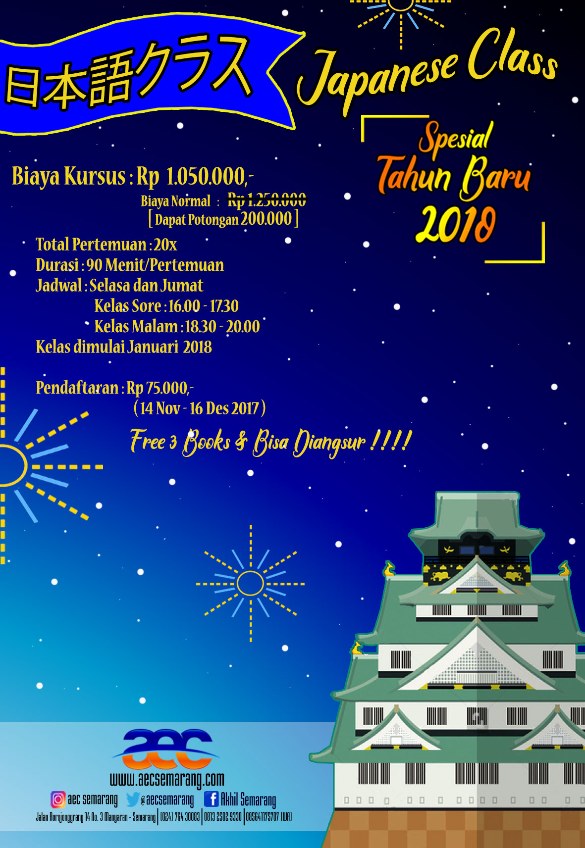 Pendaftaran Kelas Bahasa Jepang yang dibuka kali ini sangat spesial karena moment tahun baru guys. Akhil Education Centre (AEC) Semarang memberikan potongan biaya kursus pada pendaftaran kelas Bahasa Jepang kali ini. Potongan Biaya kursus hingga Rp 200.000 lho. Lumayan kan…