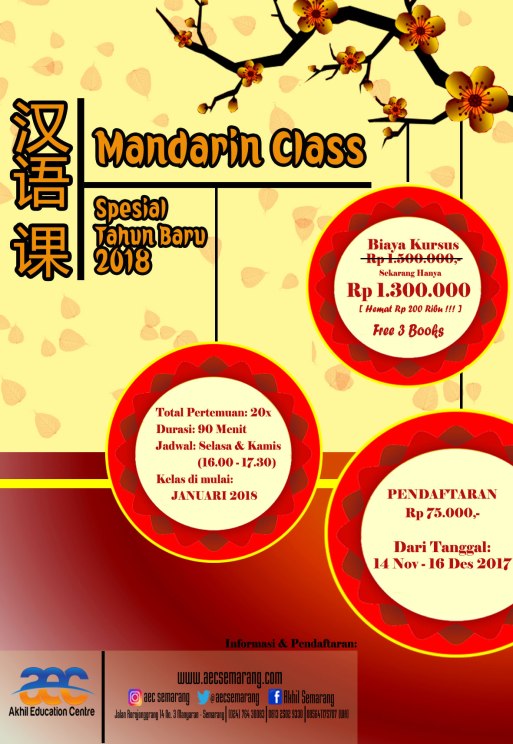 Khusus menyambut datangnya Tahun Baru 2018, Akhil Education Centre (AEC) Semarang kembali membuka Kelas Bahasa Madarin khusus untuk kalian semua. Spesial Tahun Baru jadi biaya kursus mendapat potongan sebesar 200 ribu. Selain itu GRATIIIISSSSS 3 modul pembelajaran lho. Ditambah lagi pembayaran kursus bisa diangsur 2x.