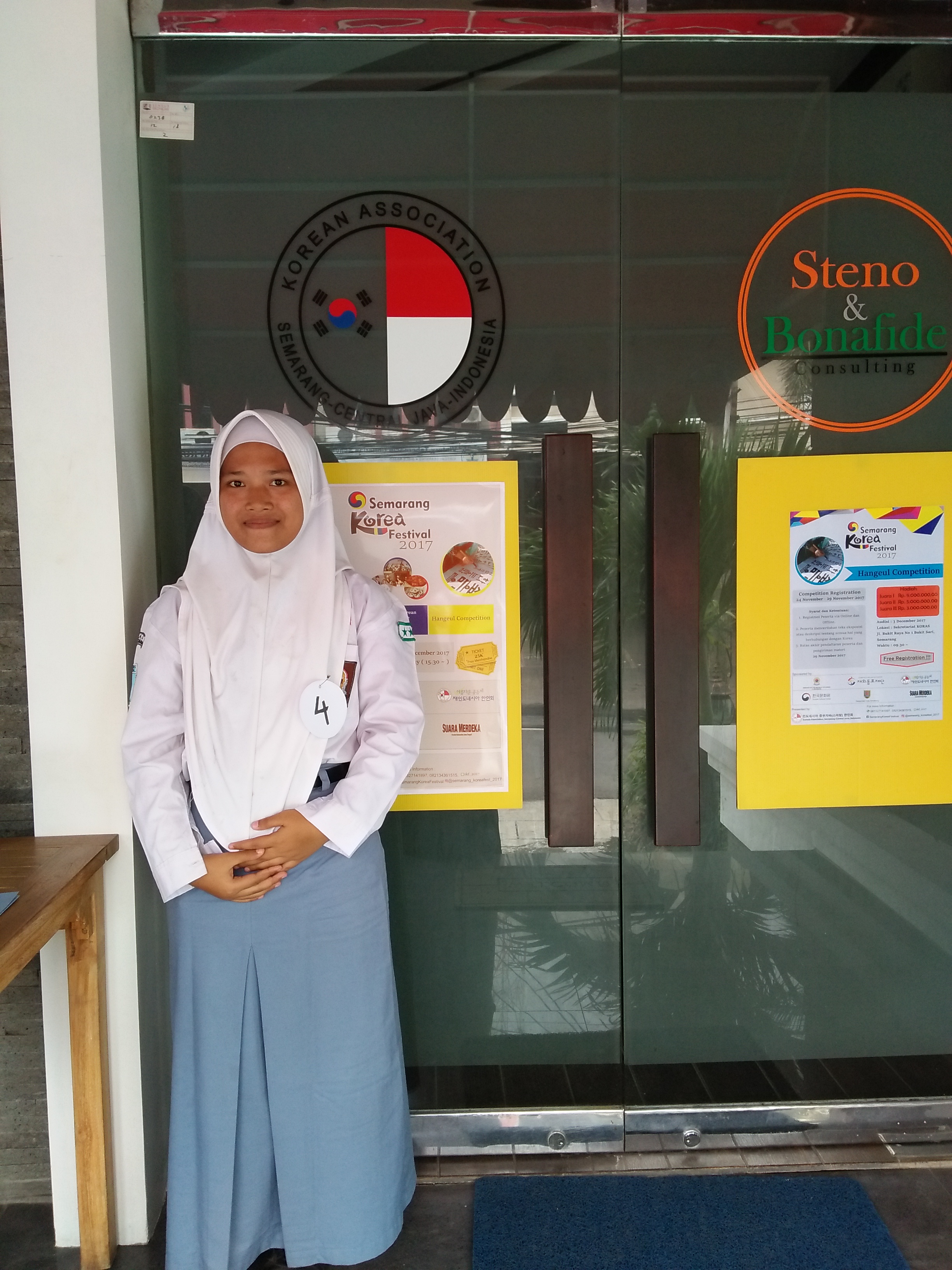 Negeri 6 Semarang yang menjadi delegasi AEC mewakili sekolahannya. Annisa mengikuti kategori lomba Hangeul Competition [Lomba berpidato dalam Bahasa Korea]. Semangat Anisa dalam mengikuti event lomba ini sangat tinggi lho guys. Annisa membawakan pidato dengan tema Gyeongbokgung Palace [Istana Korea Selatan].