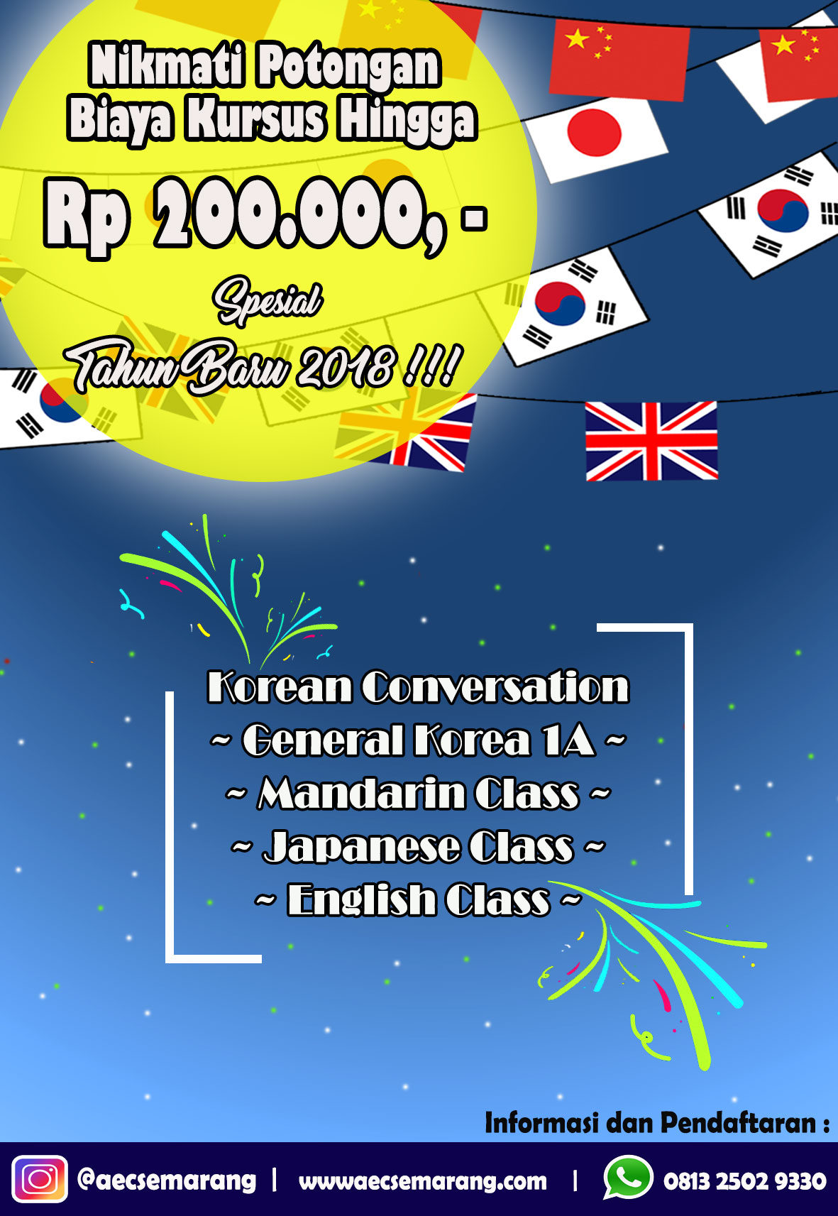 Pendaftaran Kursus Bahasa AEC tahun 2018 ini ada yang SPESIAL lho. Spesialnya pakai banget. Kenapa, karena AEC Semarang memberikan POTONGAN BIAYA KURSUS hingga 200 ribu. Selain itu biaya Kursus BISA di ANGSUR juga. Tambah menarik kan. Yuk segera mendaftar sekarang juga !!!