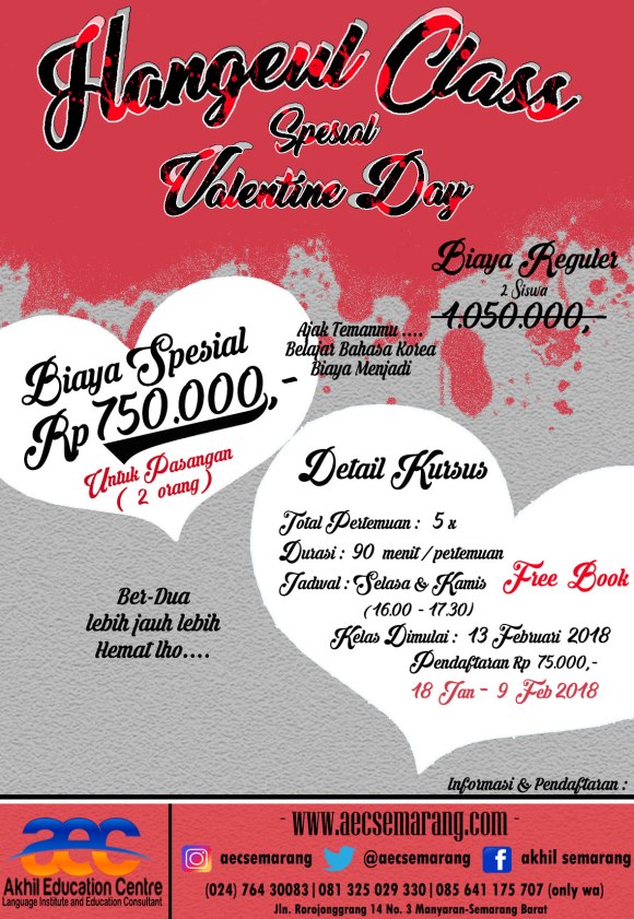 Akhil Education Centre (AEC) Semarang membuka kelas Bahasa Korea untuk pasangan lho khusus dibulan Februari 2018 saja.