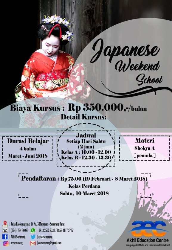 Akhil Education Centre (AEC) Semarang membuka pendaftaran Kursus Bahasa Jepang khusus di Weekend saja. Kalian-kalian yang hanya punya waktu luang di Weekend saja bisa ikutan Kursus ini nih.