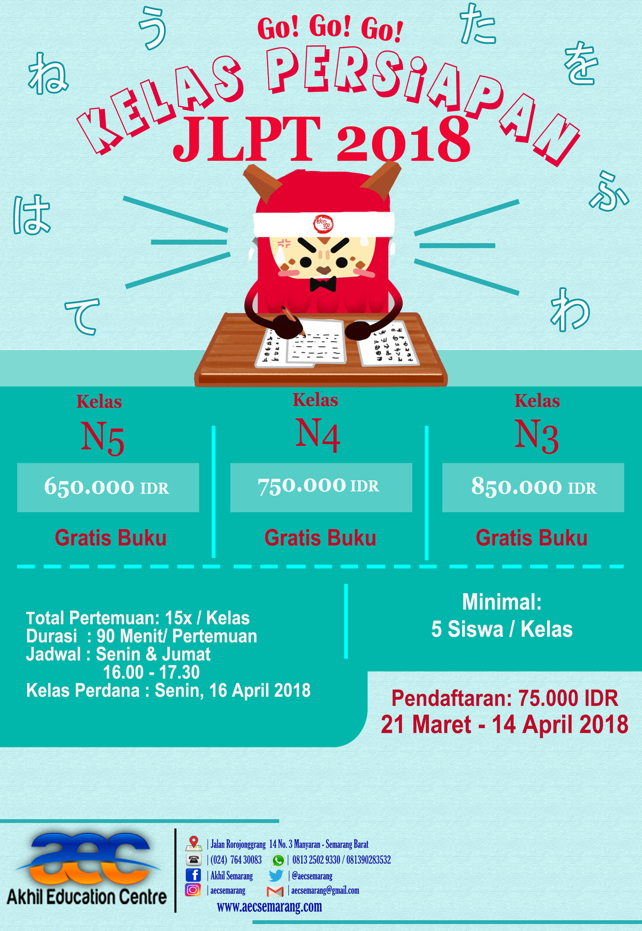 Akhil Education Centre (AEC) Semarang membuka kelas Bahasa Jepang khusus untuk mempersiakan ujian JLPT bulan Juli 2018 mendatang. Diartikel sebelumnya sudah dibahas ya mengenai apa itu Ujian JLPT.