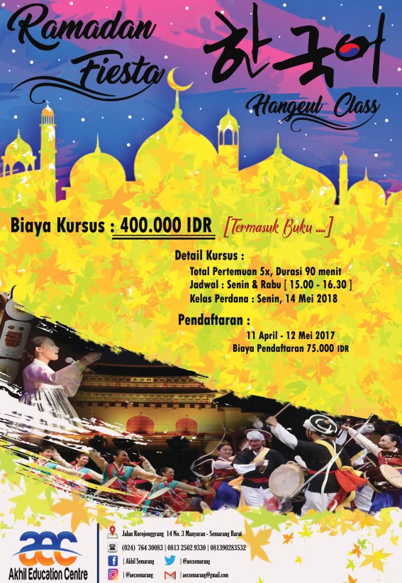 Kursus Bahasa Korea Program Ramadan Fiesta ini, pendaftaran sudah di buka dan akan berakhir 12 Mei 2018. Biaya pendaftaran 75.000,-. Diingat-ingat ya batas terakhir pendaftarannya.