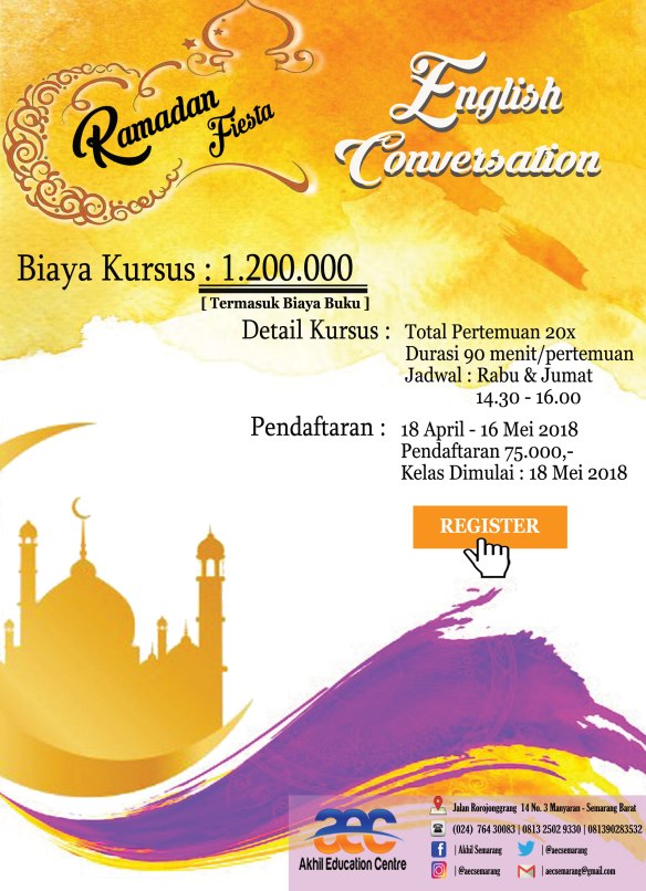 Kabar gembira pagi ini teman. Akhil Education Centre Semarang (AEC) Semarang membuka pendaftaran Kursus Bahasa Inggris [Inglish Conversation]. Kursus Bahasa Inggris ini merupakan rangkaian kegiatan di Program Ramadan Fiesta.