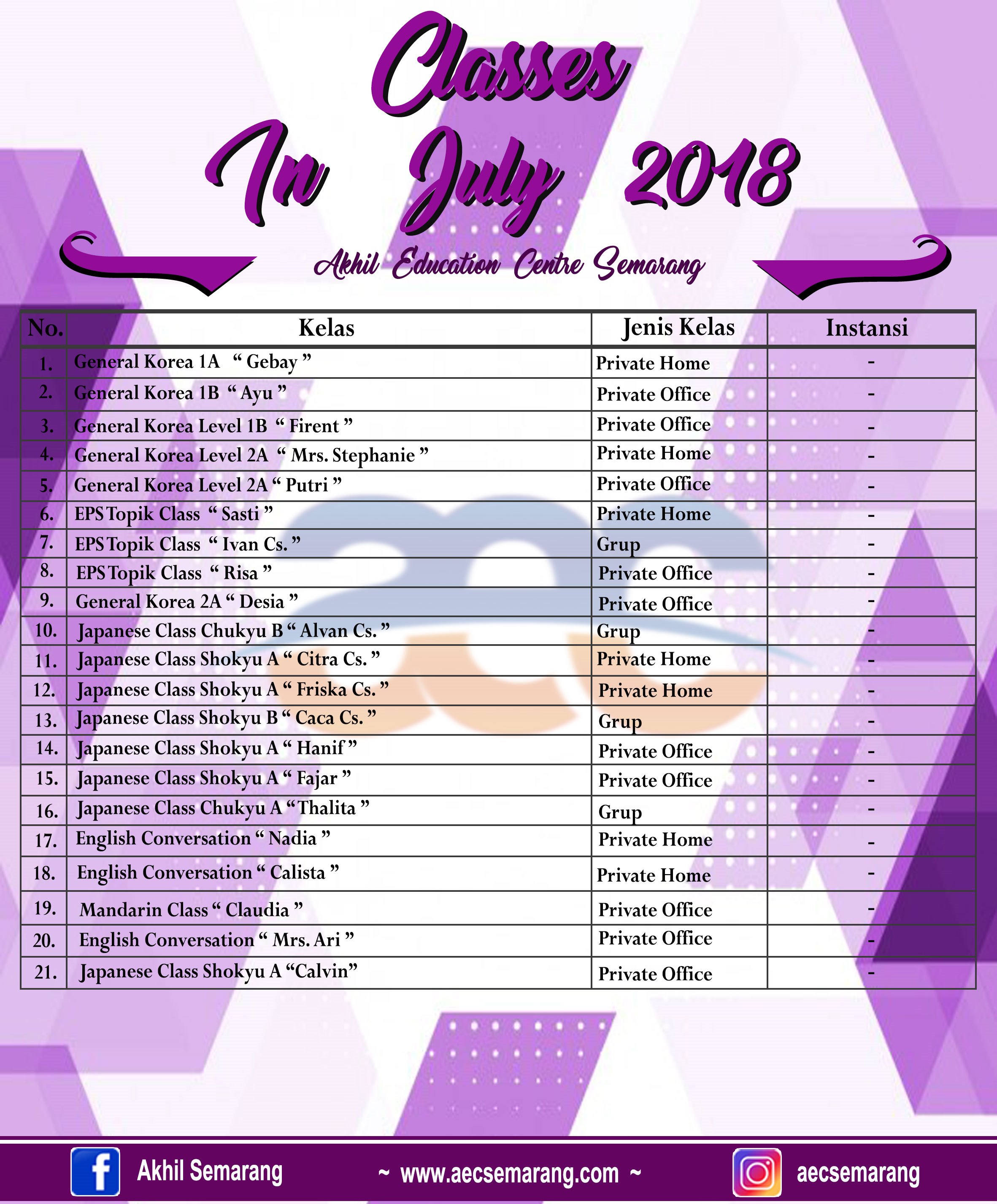 Awal bulan ya ….???? Saatnya kita update kelas-kelas yang ada di Akhil Education Centre [AEC] Semarang Bulan Juli 2018 ini. Kelas-kelas Bahasa Asing di Akhil Education Centre Semarang bulan Juli ini sangat bervariasi guys. Kelas-kelas tersebut meliputi Kelas Bahasa Korea, Kelas Bahasa Jepang, Kelas Bahasa Inggris dan Kelas Bahasa Mandarin.