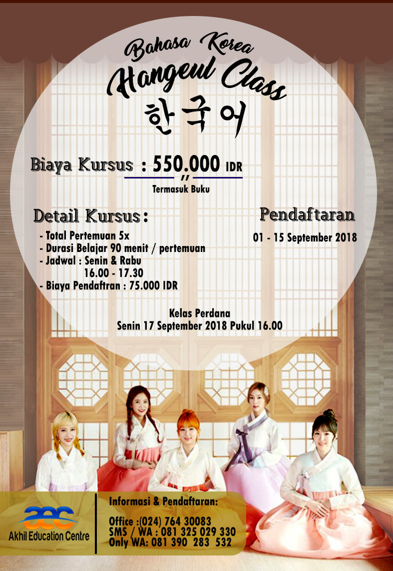 Bulan September 2018 ini Akhil Education Centre [AEC] Semarang membuka pendaftaran Kursus Bahasa Korea untuk level Pemula atau Kelas Hangeul. Teman-teman yang ingin belajar Bahasa Korea bisa langsung gabung di kelas ini. Detail Kursus Bahasa Korea level Pemula sebagai berikut: