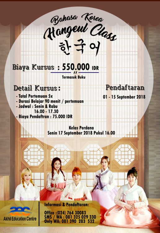 Teman-teman yang ingin belajar Bahasa Korea, langsung saja merapat ke Akhil Education Centre [AEC] Semarang ya. Pendaftaran Kelas Bahasa Korea khusus pemula periode September 2018 masih dibuka di lho.
