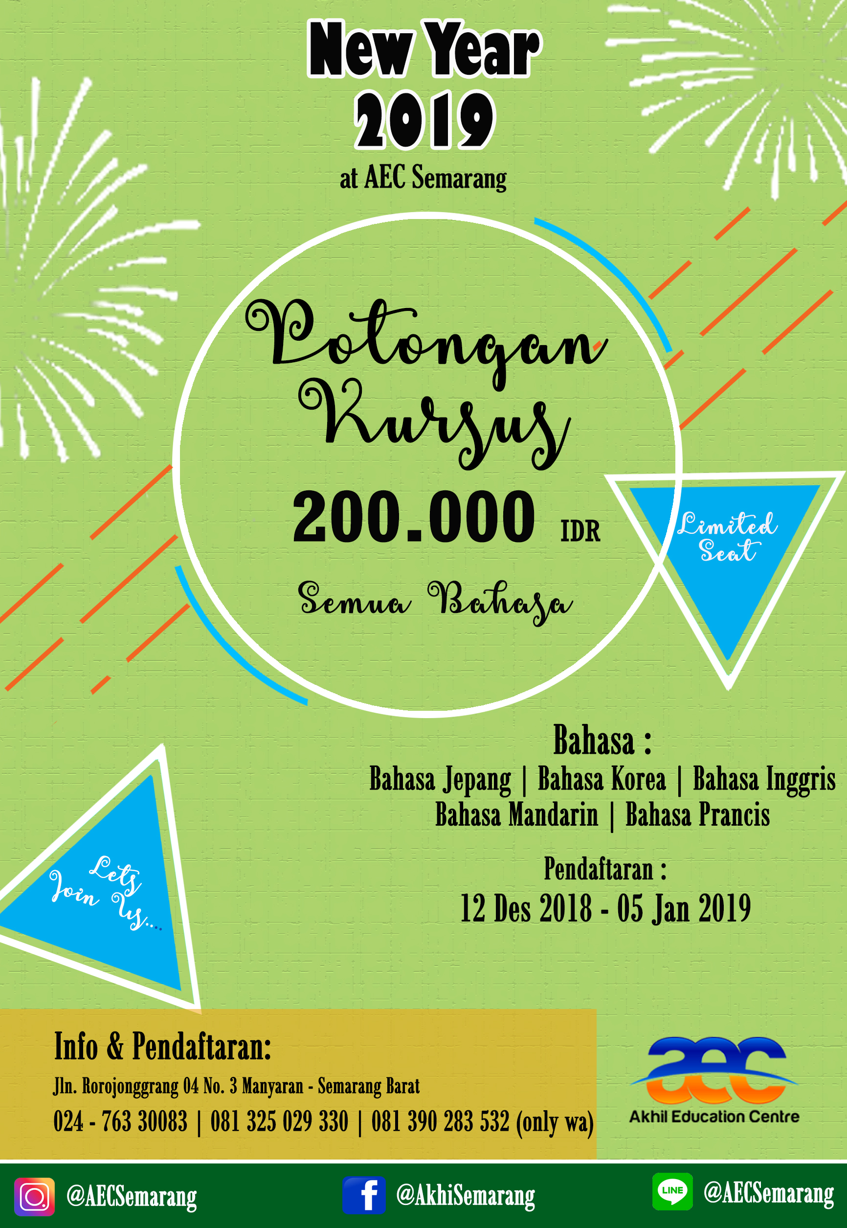 Akhil Education Centre [AEC] Semarang kembali memberikan kejutan di penghujung tahun 2018 ini lho. Dalam Rangka menyambut datangnya Natal & Tahun Baru 2019  yang tinggal menghitung hari lagi, Akhil Education Centre [AEC] Semarang memberikan Potongan Biaya Kursus.