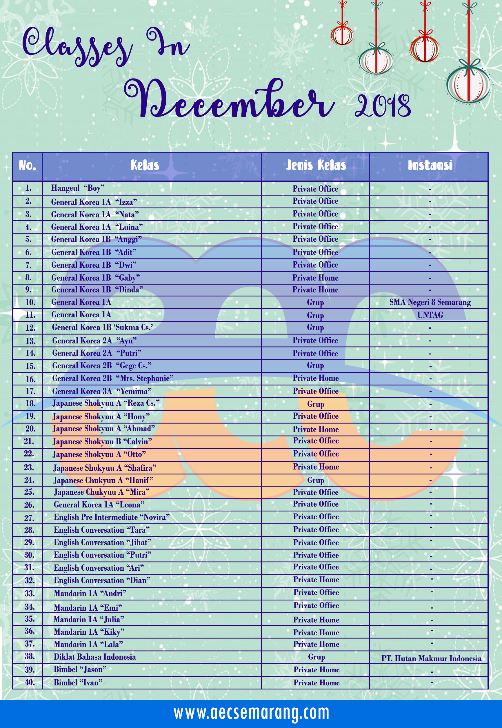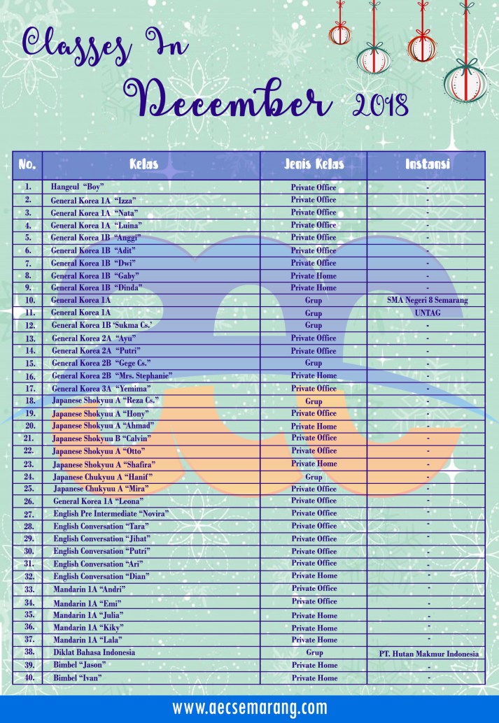Kelas-kelas Bahasa di AEC Semarang untuk periode Desember ini sangat bervariasi. Ada kelas Bahasa Korea, Bahasa Jepang, Bahasa Inggris dan Bahasa Mandarin. Detail kelas seperti apa bisa kalian lihat pada poster di bawah ini ya…