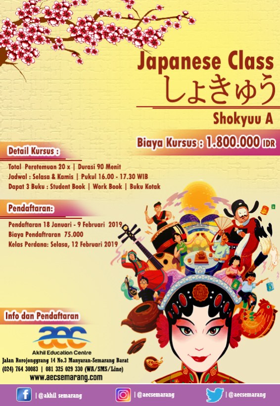 Akhil Education Centre [AEC] Semarang kembali membuka pendaftaran kelas Bahasa Jepang untuk kelas Reguler / Kelompok. Kelas Bahasa Jepang yang dibuka kali ini untuk periode Februari 2019 dan merupakan Kelas Pemula/Dasar [Shokyyu A]. Jika teman-teman ingin belajar tapi sama sekali belum bisa, jangan khawatir. Semua akan belajar dari Nol.