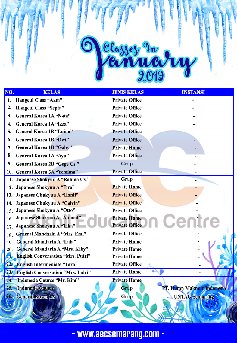 Seperti biasa, saatnya kita Update kelas-kelas yang ada di Akhil Education Centre [AEC] Semarang untuk bulan Januari 2019 ini.