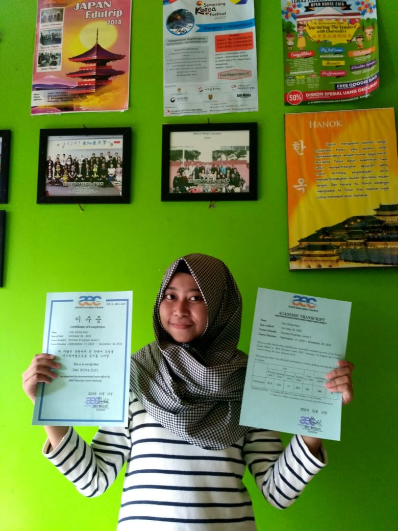 Pertengahan Bulan Januari 2019 kemarin, Dwi telah menyelesaikan belajar General Korea Level 1 [ 1A & 1B]. Dwi menyelesaikan belajar Level 1 ini dalam durasi 5 bulan. Pertengahan September 2018, Dwi memulai belajar Bahasa Korea di Akhil Education Centre [AEC] Semarang dengan Level Hangeul. Bulan Oktober – November, General Korea 1A selesai di pelajari Dwi. Bulan Desember hingga Pertengahan Januari 2019 Dwi menyelesaikan kelas General Korea 1B. Setelah itu Dwi mengikuti ujian Akhir General Korea Level 1. Hasil Ujian Dwi memuaskan. Dwi mengambil kelas private office dengan jadwal 3x seminggu [Senin, Rabu, & Jumat]. Saat ini Dwi sudah kembali ke kota asal kelahirannya di Medan.