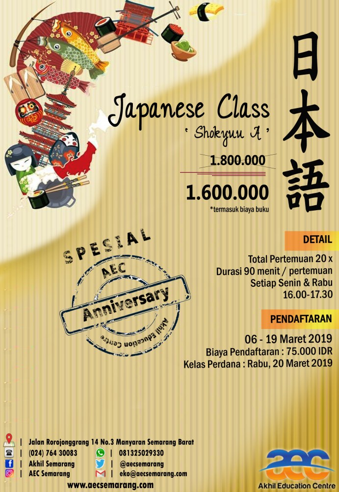 Kabar Gembira pertama di bulan Maret 2019 ini teruntuk teman-teman yang ingin Belajar Bahasa Jepang. Akhil Education Centre [AEC] Semarang membuka Pendaftaran Kelas Bahasa Jepang Spesial Anniversary AEC yg ke-4.