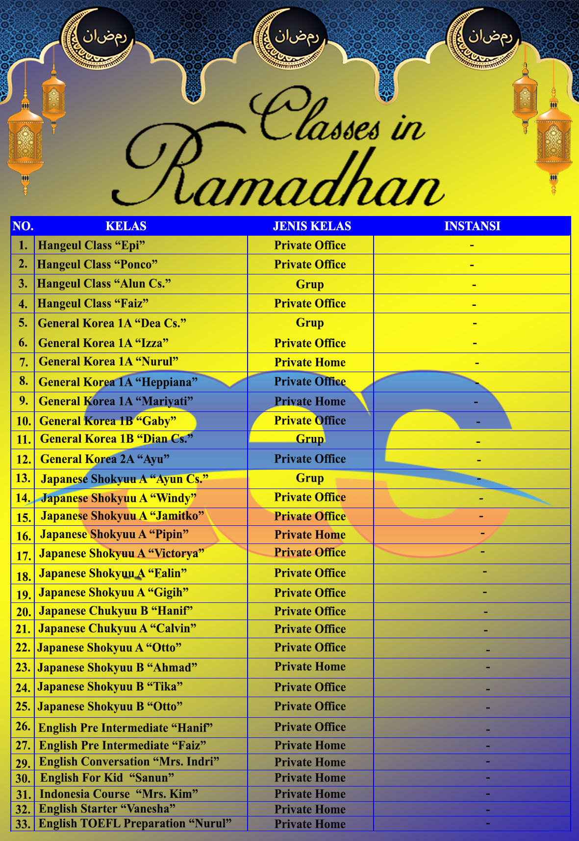 Bulan Ramadhan kali ini kelas–kelas Bahasa Asing di Akhil Education Centre [AEC] Semarang semakin padat lho….. Ada kelas Bahasa Korea, Bahasa Jepang dan Bahasa Inggris. Kelas-kelas ini terbagi menjadi beberapa tipe kelas yaitu kelas reguler, kelas private office maupun private home. Kantor AEC semakin ramai Bulan Ramadhan ini guys ^o^