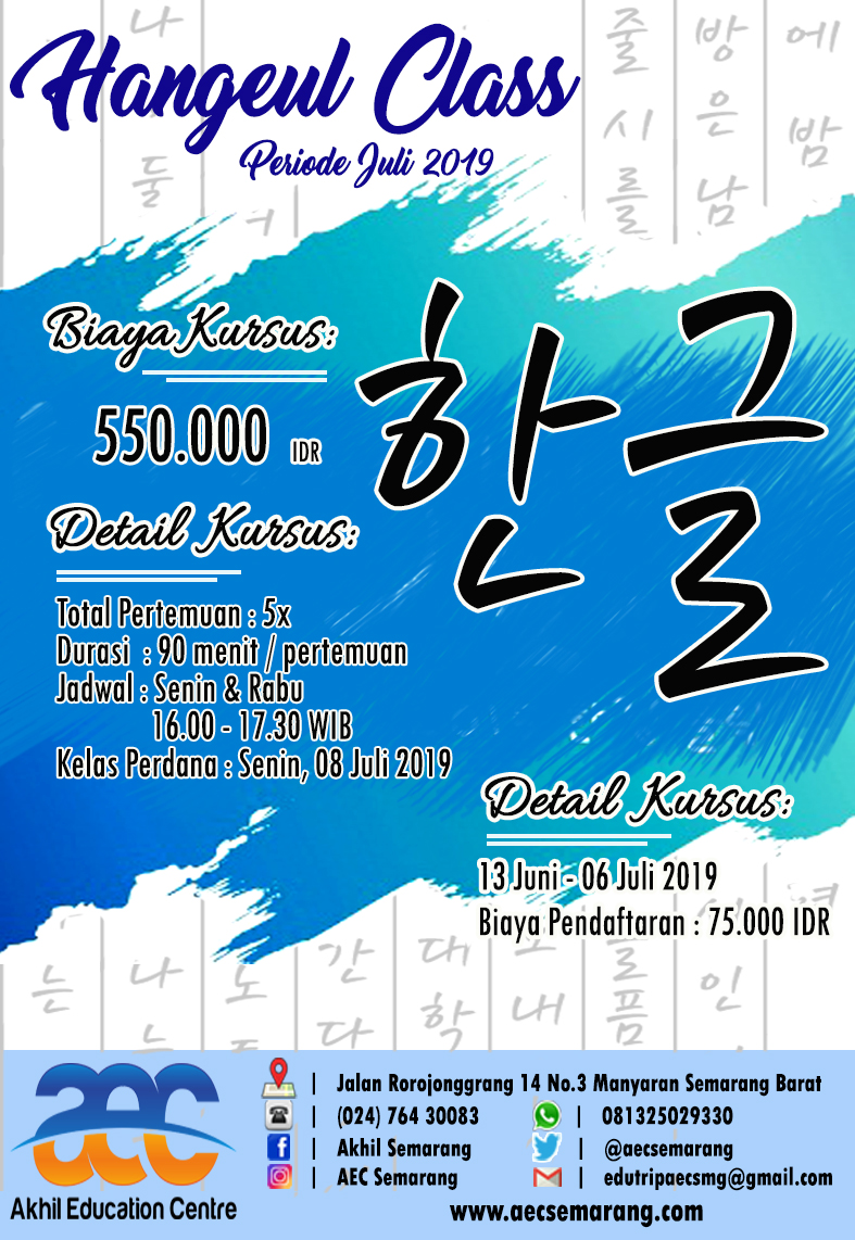 Di Moment Liburan Sekolah kali ini Akhil Education Centre [AEC] Semarang kembali membuka pendaftaran kelas Bahasa Korea guys. Teman-teman yang ingin menghabiskan waktu liburannya dengan Belajar Bahasa Korea. Langsung saja meluncur ke AEC Semarang.