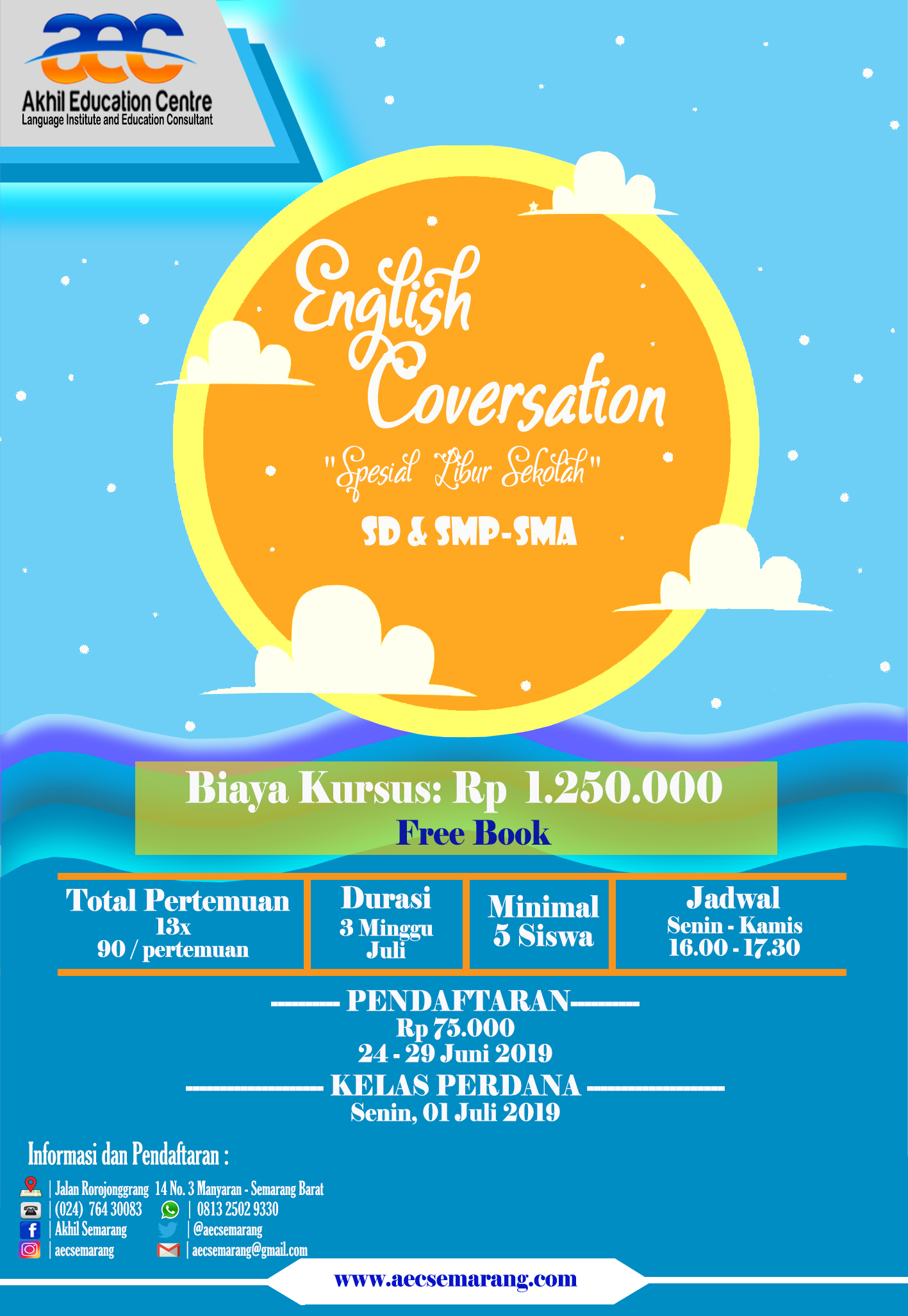 Akhil Education Centre [AEC] Semarang membuka Program Kursus Bahasa Inggris Spesial Libur Sekolah. Program ini kami buka untuk siswa-siswa SD dan SMP-SMA yang ingin memanfaatkan Libur Sekolah untuk mengasah kemampuan Bahasa Inggris.
