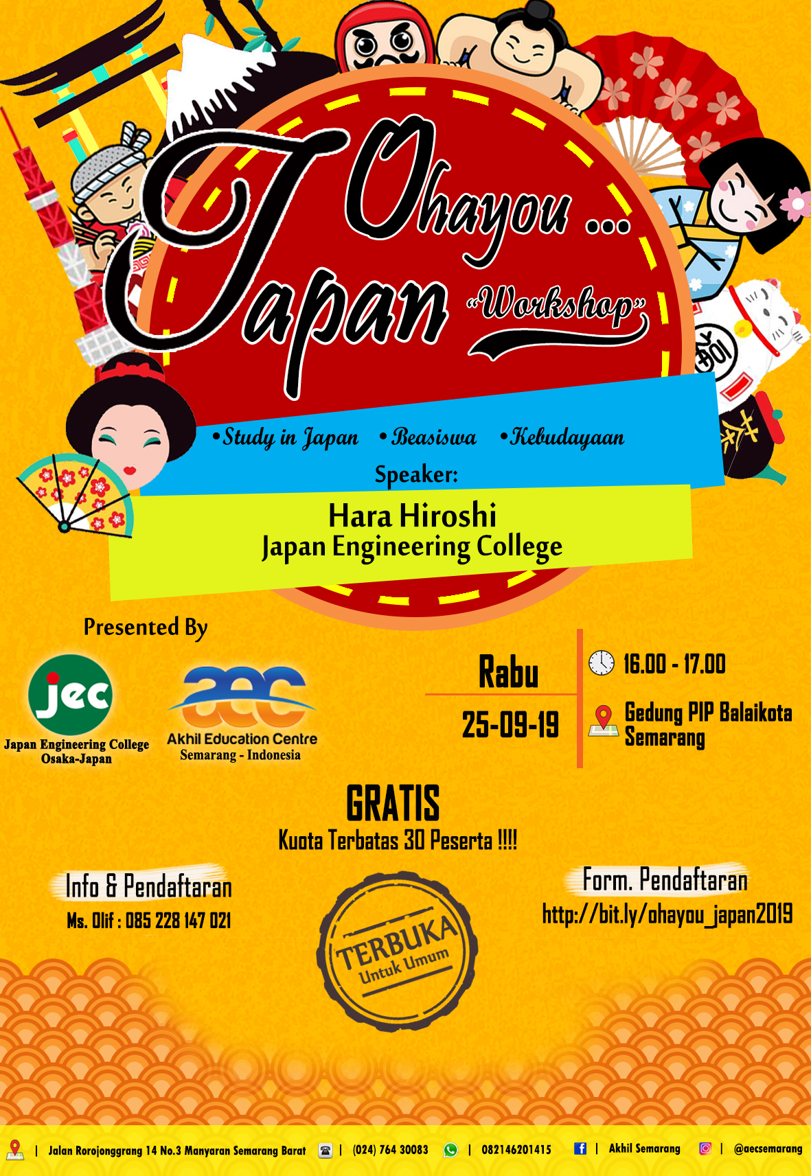 Akhil Education Centre [AEC] Semarang bekerjasama dengan Japan Engineering Collage [JEC]-Osaka akan mengadakan Workshop “OHAYOU JAPAN 2019”. Workshop ini akan diselenggarakan di bulan September mendatang.