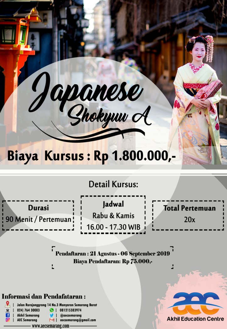 Akhil Eduction Centre [AEC] Semarang, kembali menghadirkan Kelas Bahasa Jepang. Kelas Bahasa Jepang yang dibuka kali ini adalah Kelas Bahasa Jepang Periode September 2019. Teman-teman yang sedari kemarin menuggu-nunggu Kelas Bahasa Jepang di AEC Semarang, Sekarang ini saatnya…..