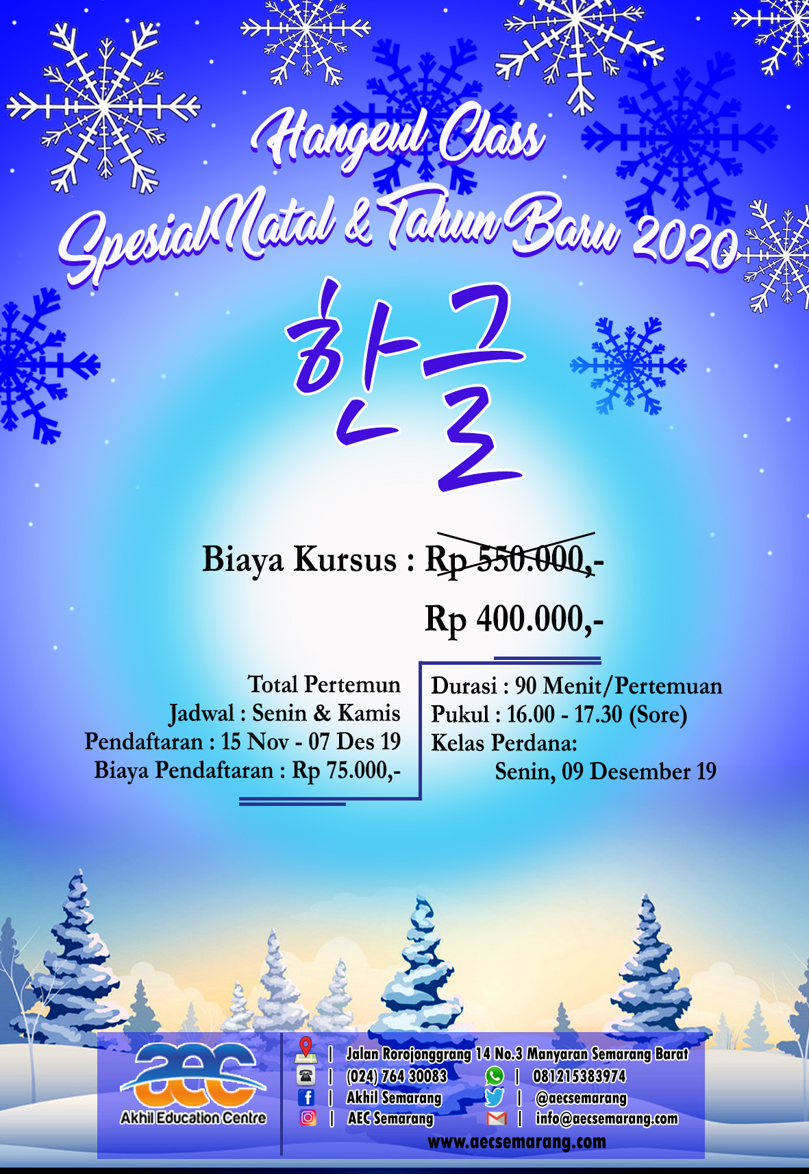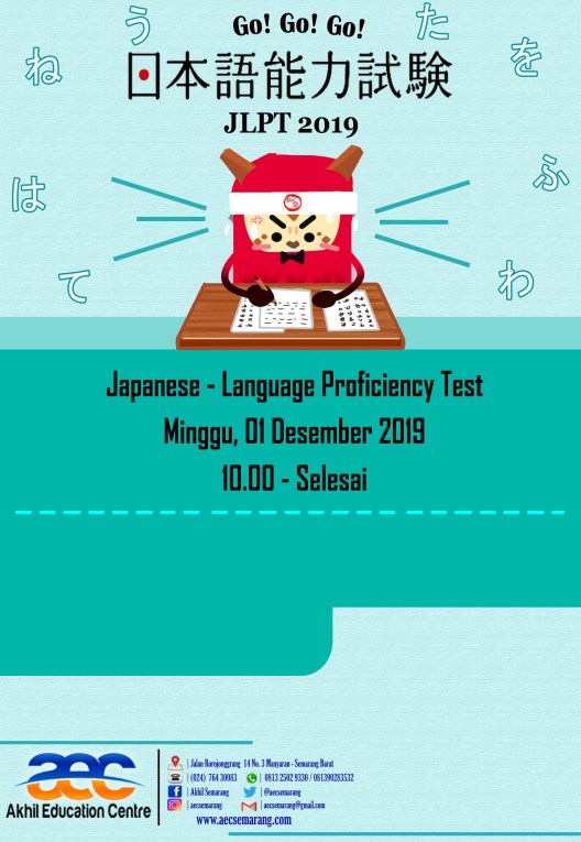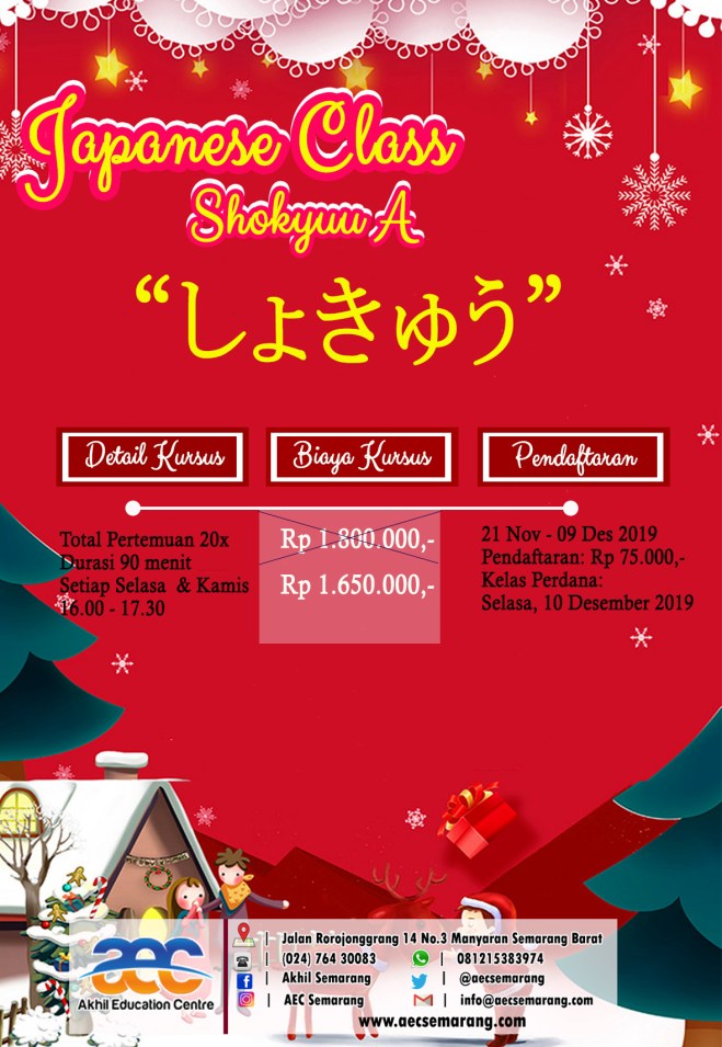 Akhil Eduction Centre [AEC] Semarang, kembali menghadirkan Kelas Bahasa Jepang. Kelas Bahasa Jepang yang dibuka kali ini adalah Kelas Bahasa Jepang Spesial Natal dan Tahun Baru 2020. Teman-teman yang sedari kemarin menuggu-nunggu Kelas Bahasa Jepang di AEC Semarang, Sekarang ini saatnya. Kalian bisa mendapatkan potongan biaya kursus hingga Rp 150.000,-