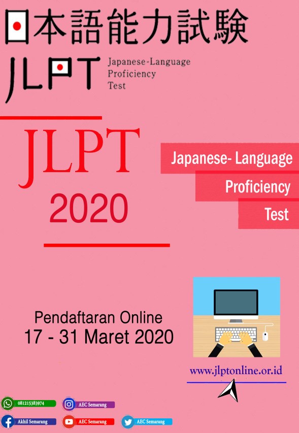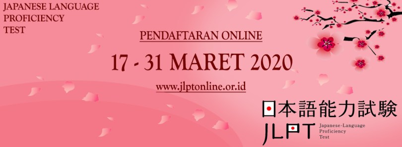Pendaftaran Ujian JLPT ini dilakukan secara online melalui website : https://jlptonline.or.id/. Untuk pelaksanaan Ujian JLPT periode pertama ini akan diselenggarakan pada tanggal 05 Juli 2020.