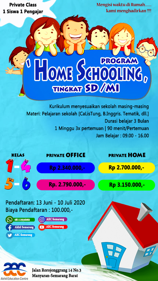 Mau belajar di kantor AEC maupun di rumah siswa bisa semua bisa disettingkan. Detail Program HOME SCHOOLING ini bisa dilihat pada poster di bawah.