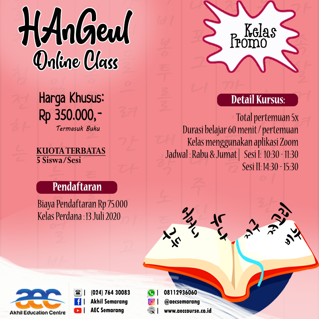 AEC Semarang membuka pendaftaran Kelas Bahasa Korea Online lho dengan biaya kursus yang sangat terjangkau. Detail Kursus Online di AEC bisa dilihat pada poster di bawah ini.