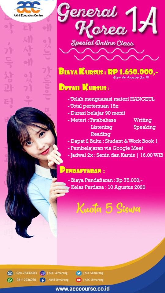 Akhil Education Centre [AEC] Semarang menghadirkan kelas BAHASA KOREA ONLINE untuk kalian semua yang saat ini harus beraktivitas di dalam rumah. Buang kejenuhan dan kebosanan teman-teman dengan belajar Bahasa Korea Online bersama AEC Semarang.
