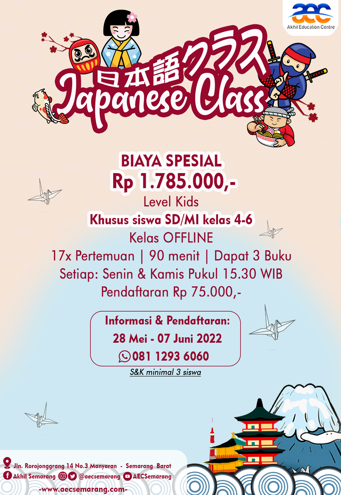 AEC Semarang akan memberikan potongan biaya kursus di kelas Bahasa Korea Pemula di pecan libur sekolah kali ini. Detail kelas Bahasa Korea Pemula yang dibuka sebagai berikut: