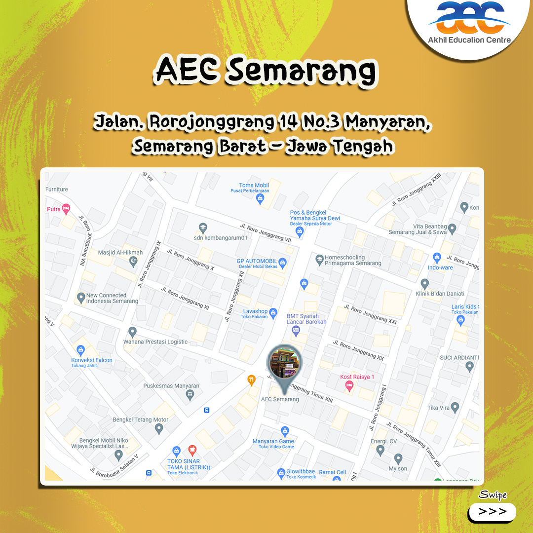 Kantor Akhil Education Centre [AEC] Semarang ada di wilayah Semarang Barat. Tepatnya di Jln. Rorojonggrang 14 No. 3 Manyaran. Agak serong ke gang, tapi masih terlihat dari jalan raya [Jalan Abdul Rahmat Saleh]. Kantor AEC Semarang dekat dengan Rumah Dinas Walikota dan Pintu masuk Tol Manyaran. Kalian yang sudah tahu Rumah Dinas Walikota Semarang, akan lebih mudah mencari lokasi AEC Semarang.