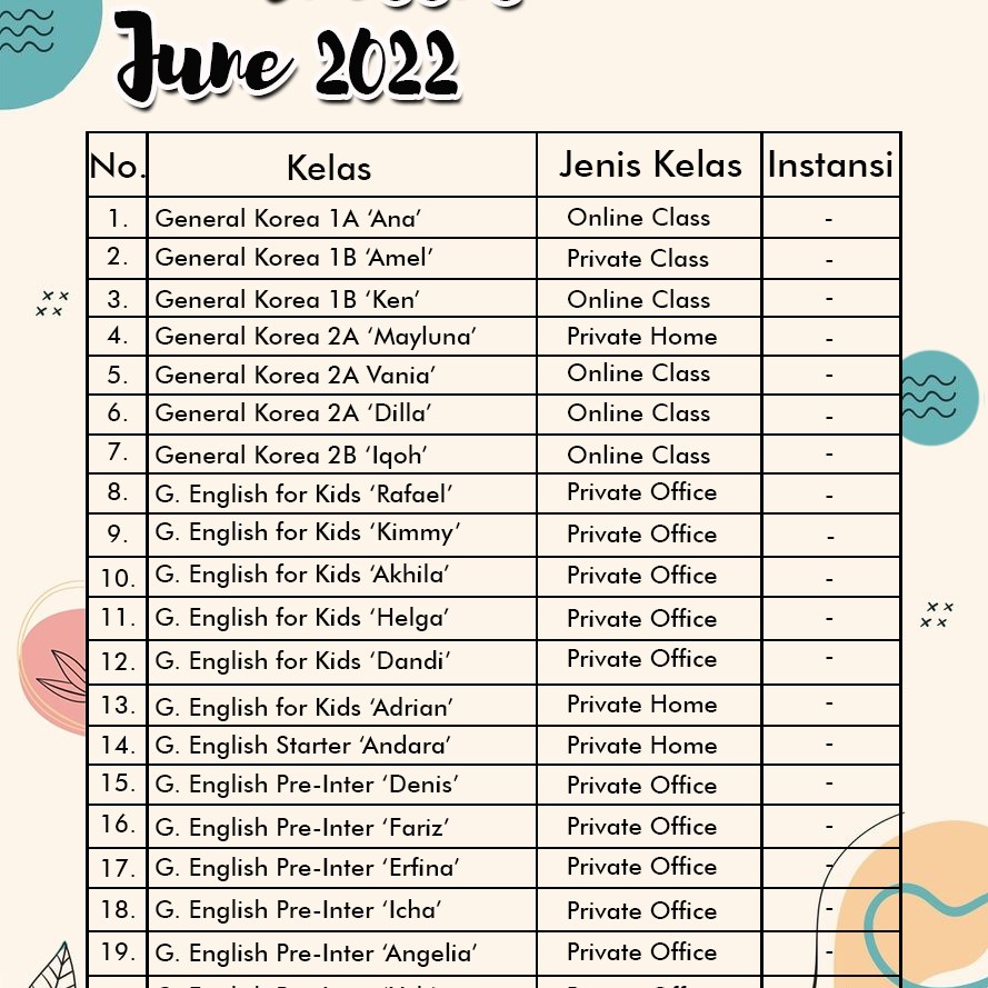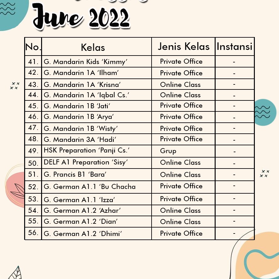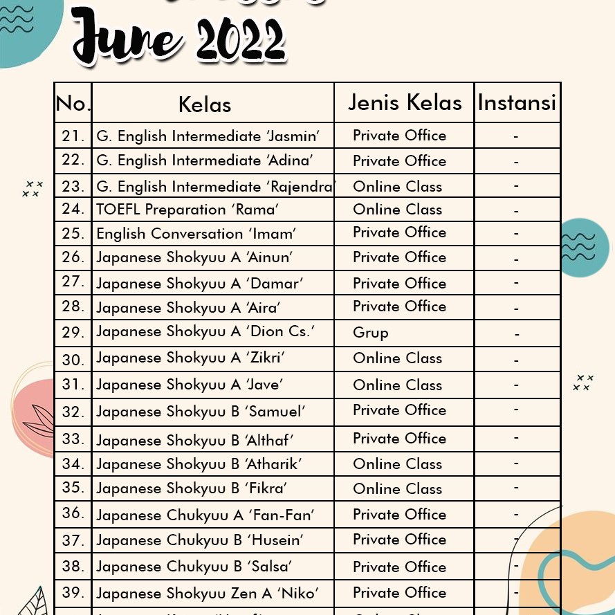 Di bulan Juni 2022 ini ada Kak Salsa, Kak Husein, Kak Fan-Fan, Kak Dion & Kak Affa, Kak Damar, Kak Aira, Kak Ainun, Kak Althaf yang belajar Bahasa Jepang di AEC Semarang. Siswa ini belajar bahasa Jepang ini berasal dari berbagai kategori yang berbeda.