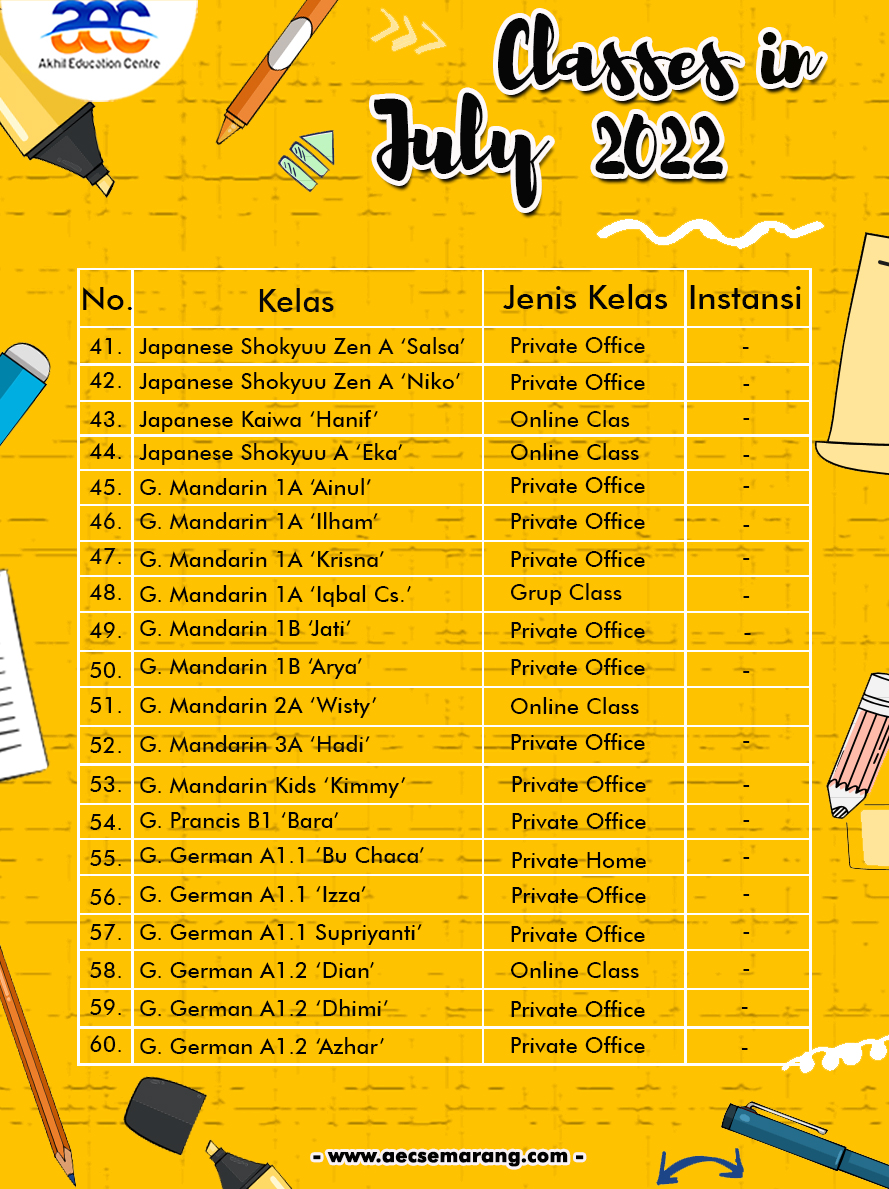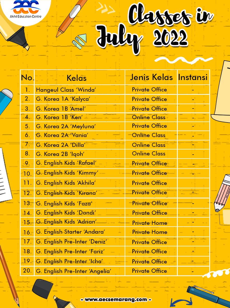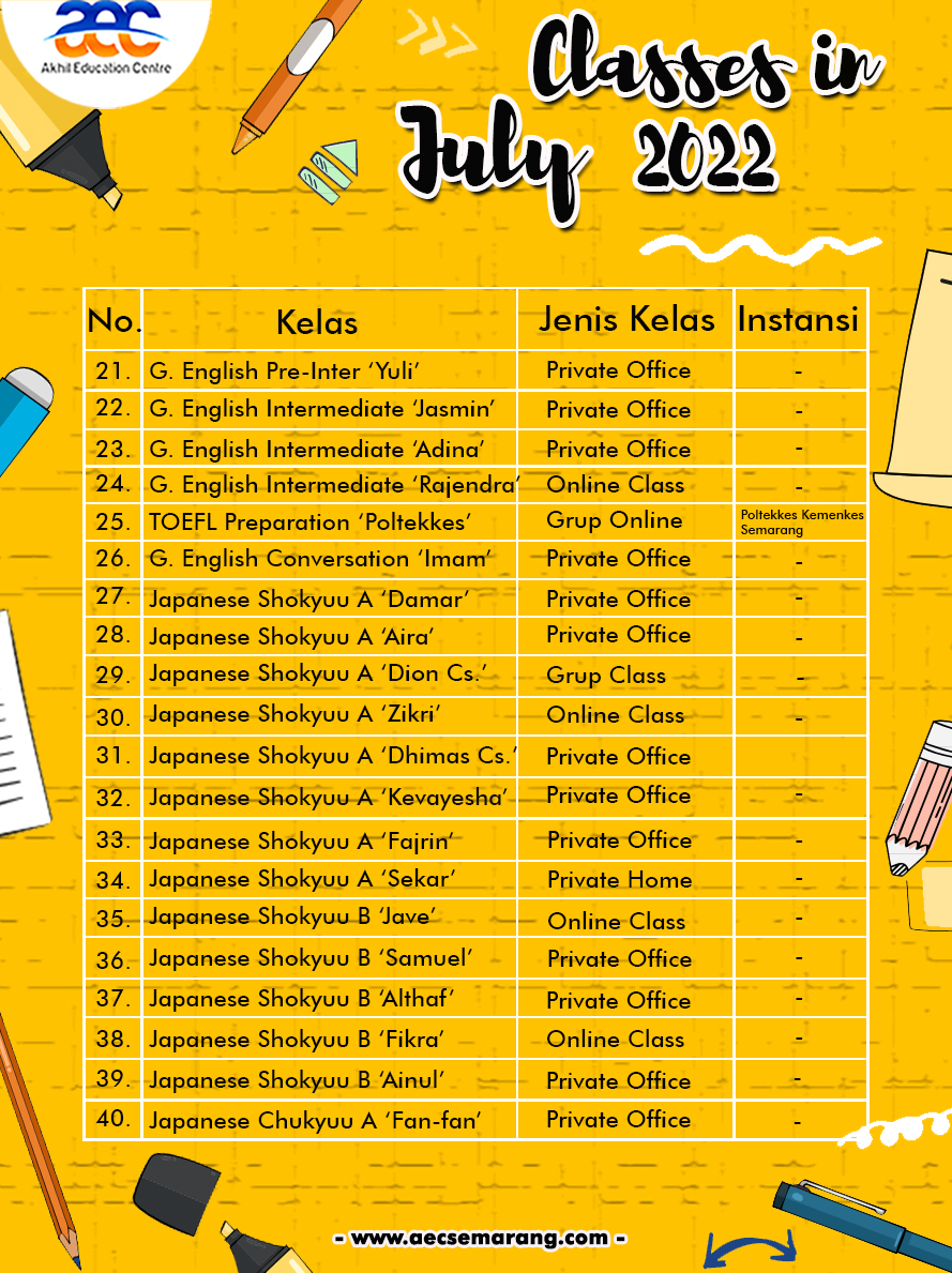 Yuhu…yuhu…. kalian penasaran kan di bulan Juli 2022 ini ada kelas apa saja di Akhil Education Centre [AEC] Semarang? Langsung aja simak update kelas-kelas di AEC Semarang bulan ini ya.