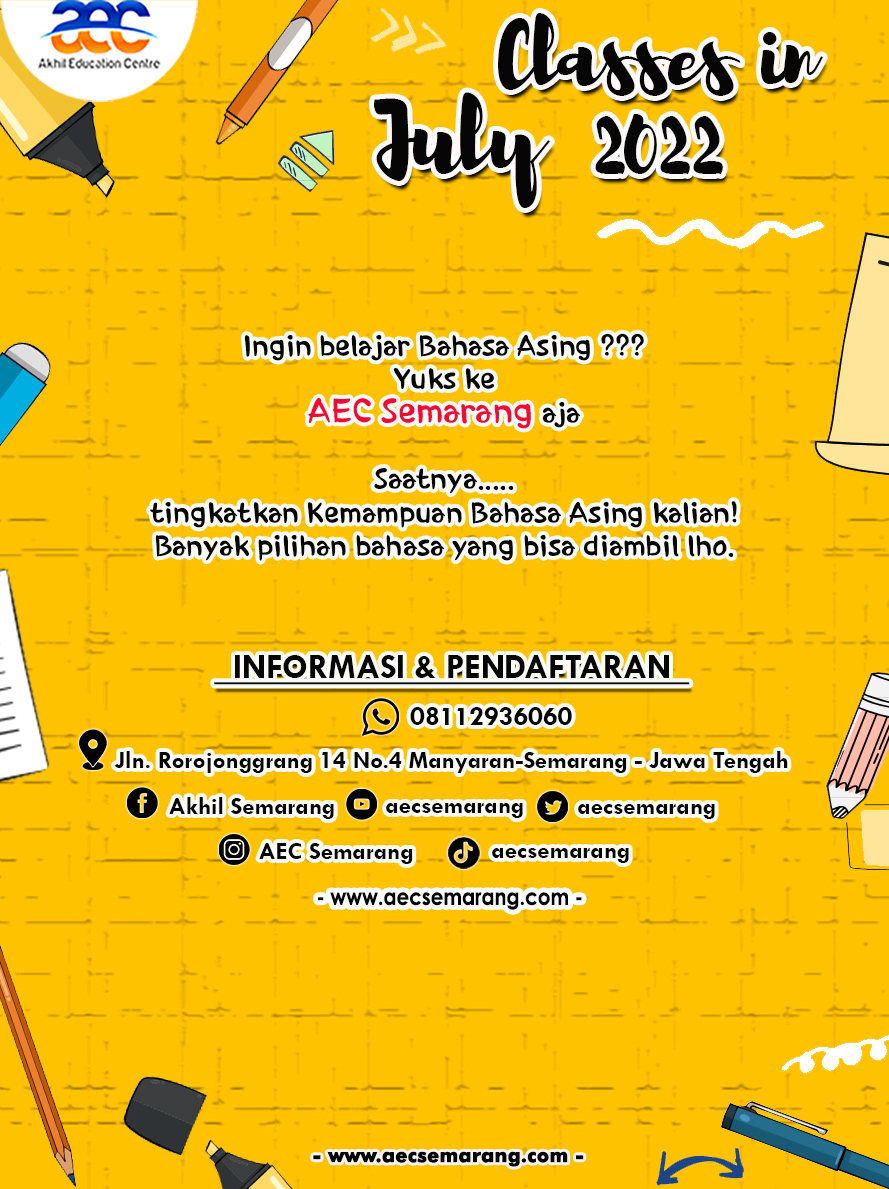 Bulan Juli ini 2022, kelas kursus Bahasa Asing di AEC Semarang kembali dipenuhi oleh siswa-siswa. Baik siswa baru maupun siswa-siswa lama yang lanjut belajar lagi di AEC Semarang ya.