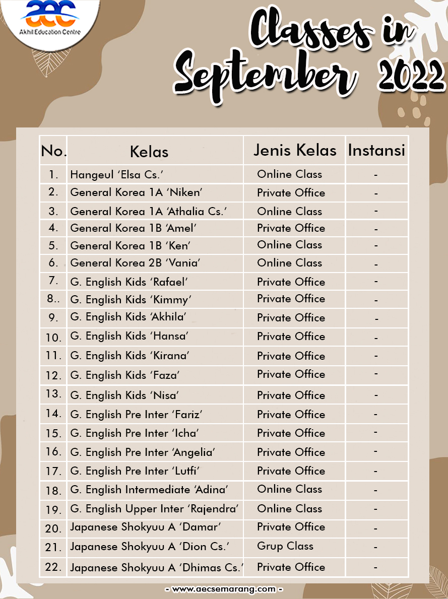 Seperti bulan-bulan sebelumnya, Bulan September 2022 ini, kelas Kursus Bahasa Asing di AEC Semarang selalu penuh dengan siswa-siswa. Baik siswa-siswa lama yang lanjut belajar lagi ataupun siswa-siswa baru.