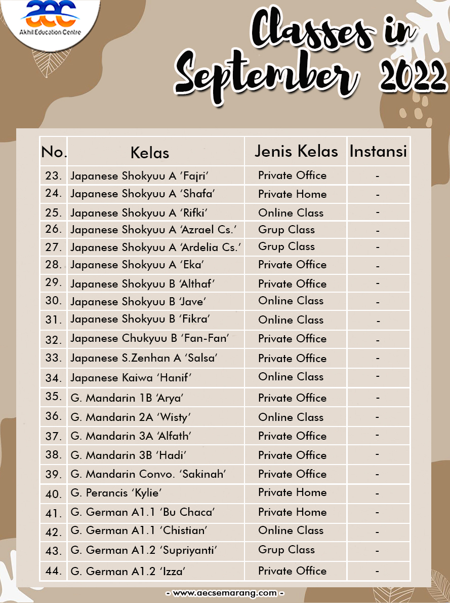 Bulan September 2022 ini, Akhil Education Centre [AEC] Semarang memiliki 46 kelas-kelas bahasa Asing. Kelas-kelas tersebut meliputi kelas Offline maupun Online. 46 kelas kursus ini meliputi Kursus Bahasa Korea, Kursus Bahasa Jepang, Kursus Bahasa Inggris, Kursus Bahasa Mandarin, Kursus Bahasa Perancis, Kursus Bahasa Jerman.